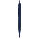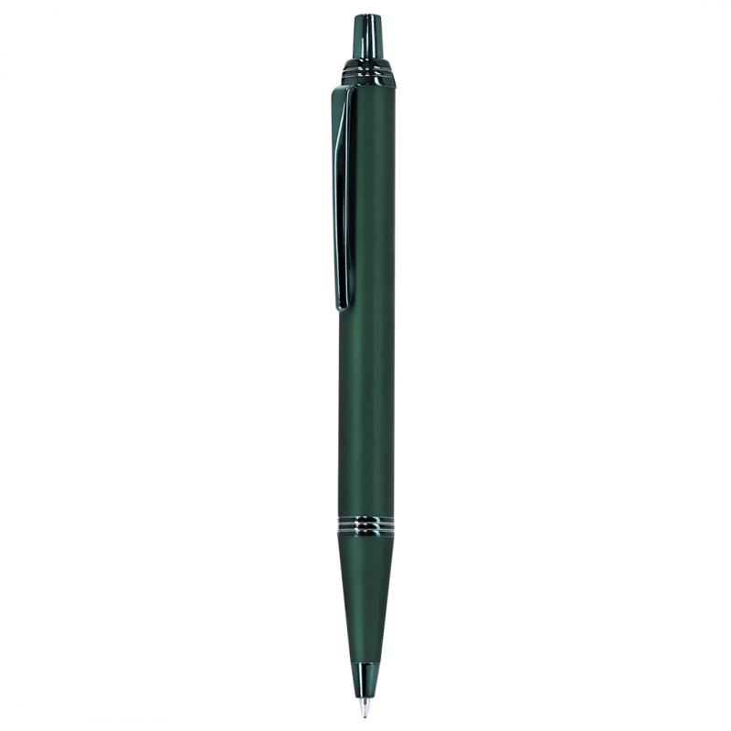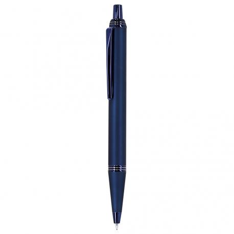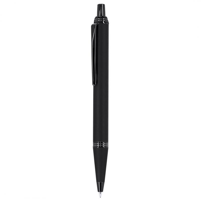 Bolígrafo con cuerpo en aluminio, acabado gomoso y detalles cromados. De mecanismo pulsador, con cartucho jumbo y tinta azul.