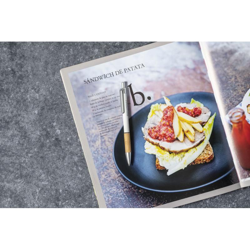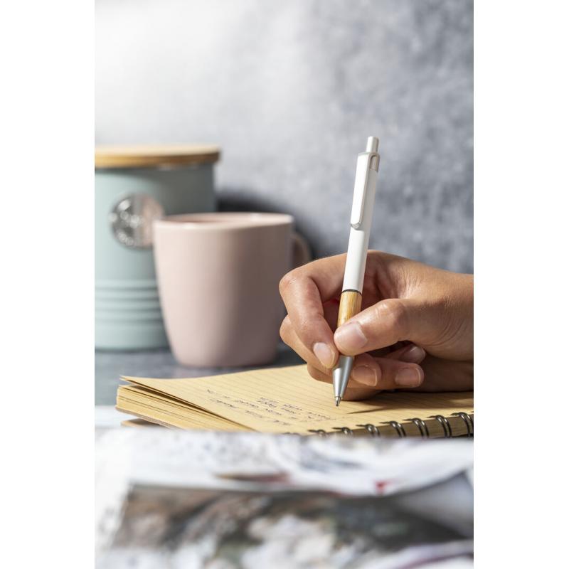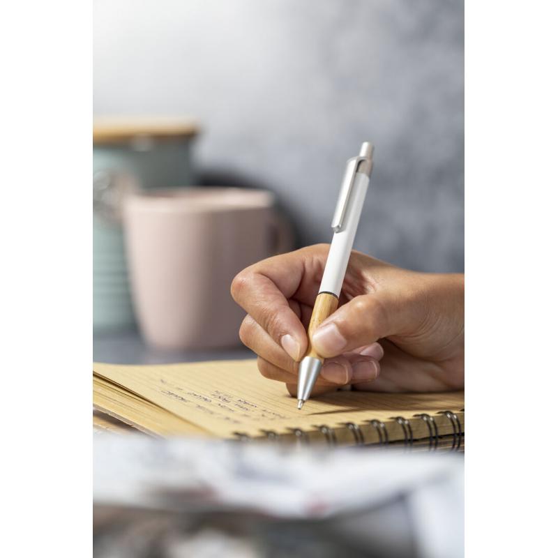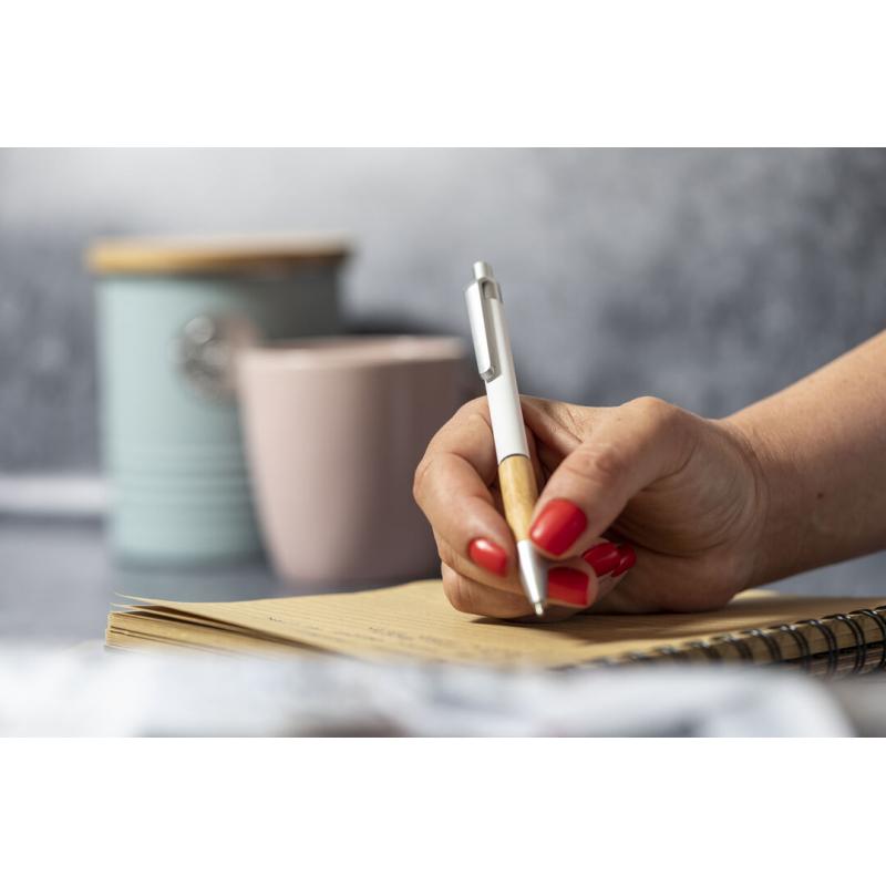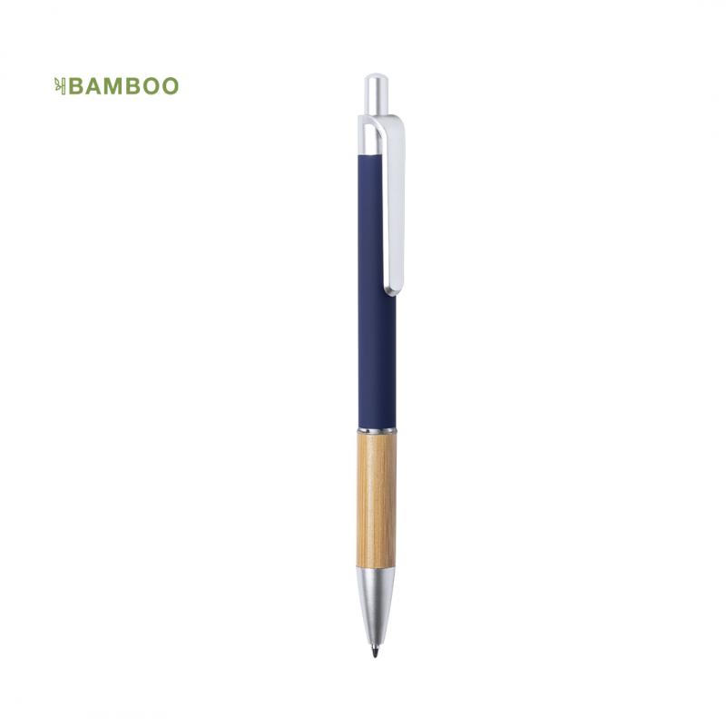 Bolígrafo de línea nature y mecanismo pulsador. De elegante diseño, con cuerpo en aluminio de acabado mate y empuñadura en bambú, con accesorios en acabado mate. Clip de acabado metalizado y anilla transparente, en tinta azul. Disponible en variada gama de colores.