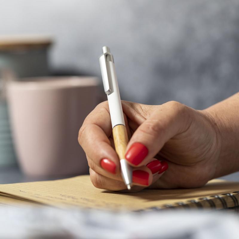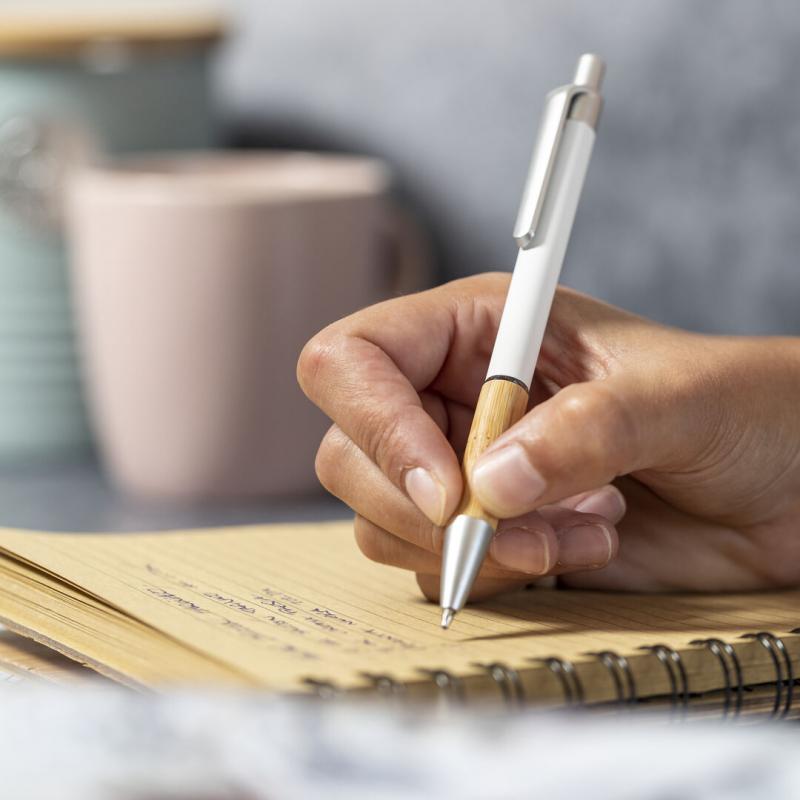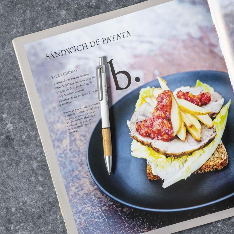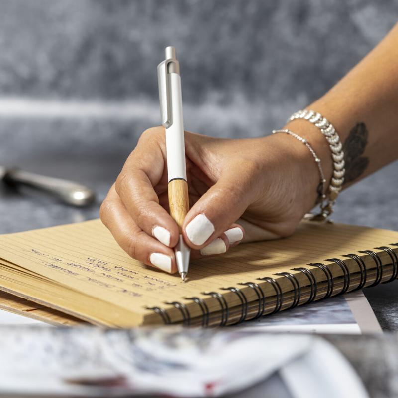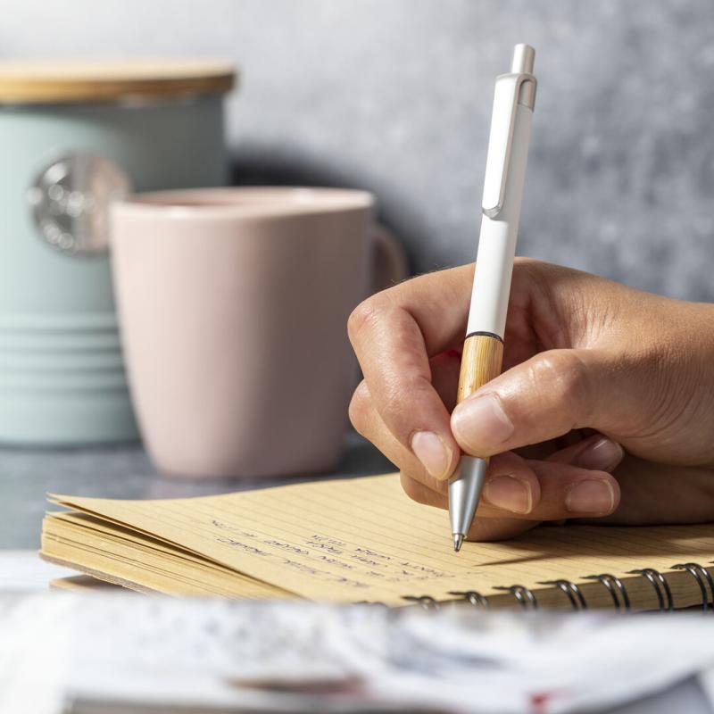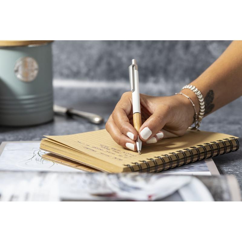 Bolígrafo de línea nature y mecanismo pulsador. De elegante diseño, con cuerpo en aluminio de acabado mate y empuñadura en bambú, con accesorios en acabado mate. Clip de acabado metalizado y anilla transparente, en tinta azul. Disponible en variada gama de colores.