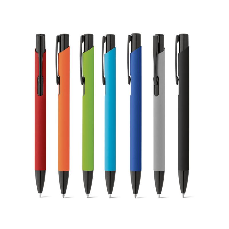Bolígrafo fabricado en aluminio en atractivos colores, con cuerpo acabado en goma y tacto suave. Escritura azulRecipiente :