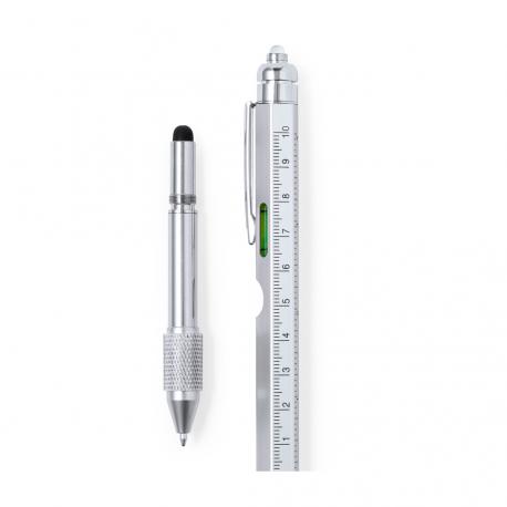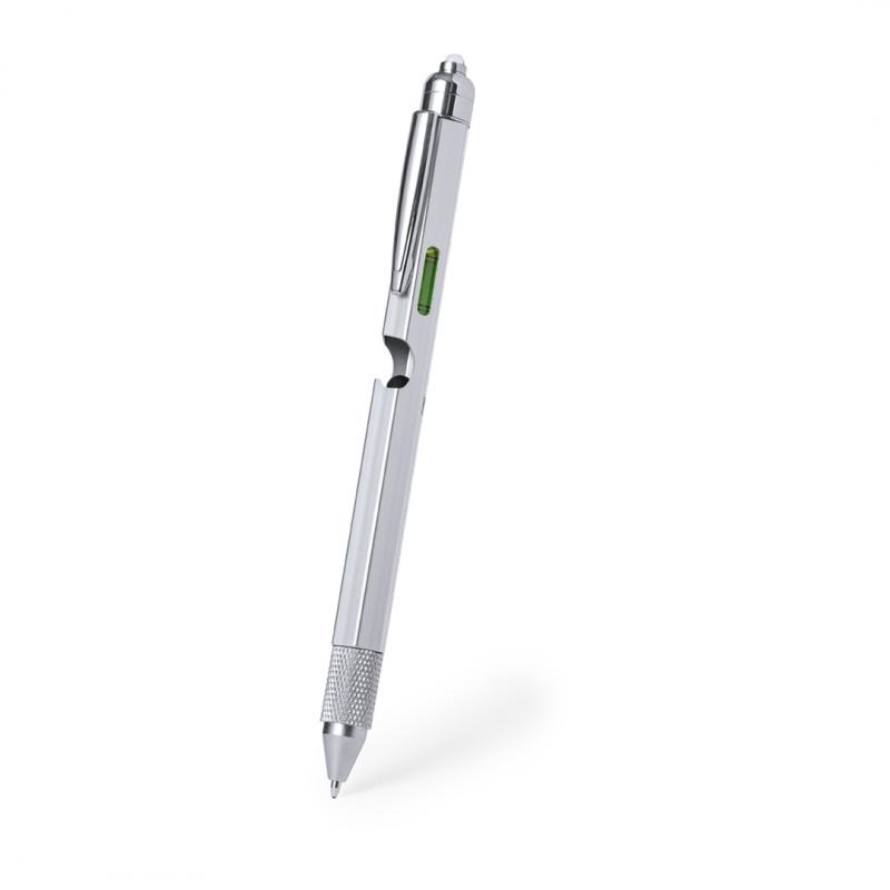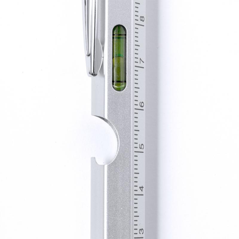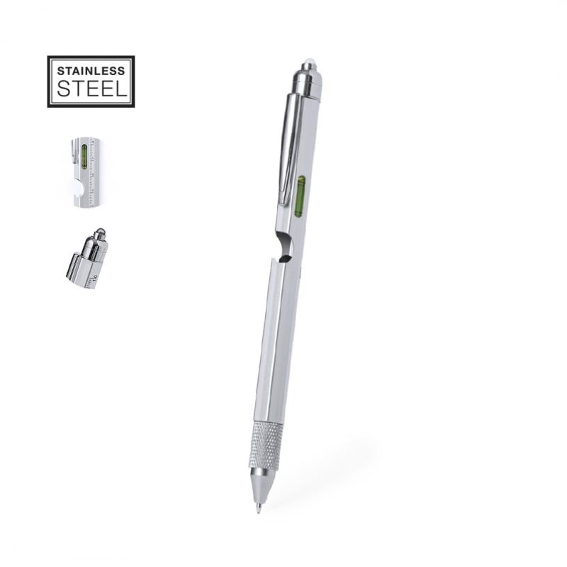Bolígrafo multifunción 8 en 1 de mecanismo giratorio, fabricado en acero inox. Incluye regla en cm y pulgadas, nivel, abridor, 1 LED alimentado por pila de botón (incluida), puntero, punta plana y philips. Con clip metálico y tinta azul. Presentado individualmente en caja de diseño kraft.