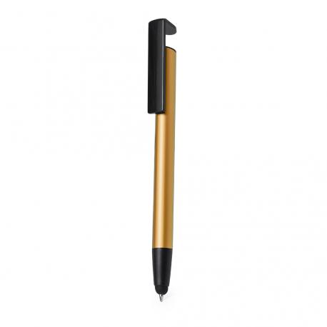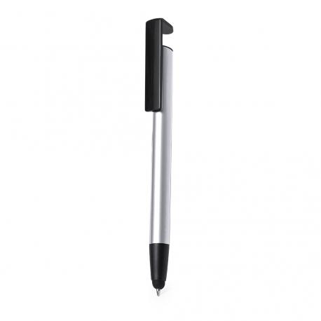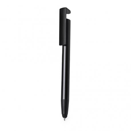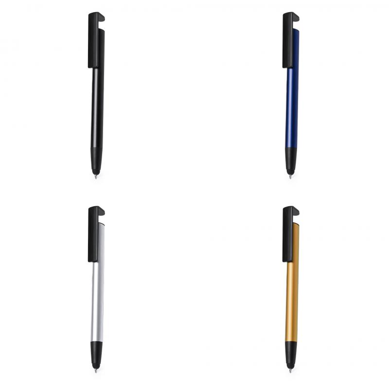 Bolígrafo puntero de mecanismo pulsador, fabricado en resistente aluminio. Con soporte para dispositivo móvil integrado en clip y suave cuerpo en variada gama de colores metalizados. En tinta azul y presentado individualmente en bolsa reciclada.