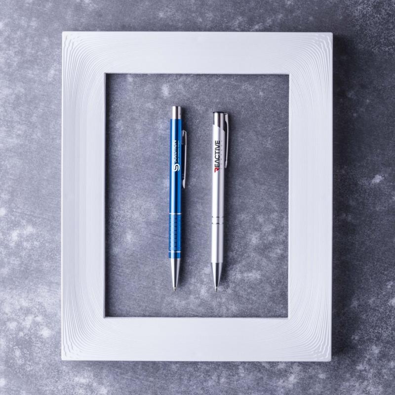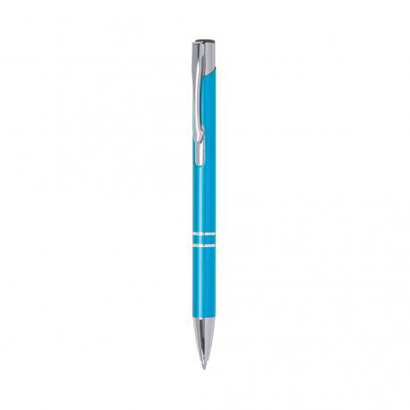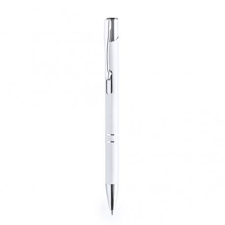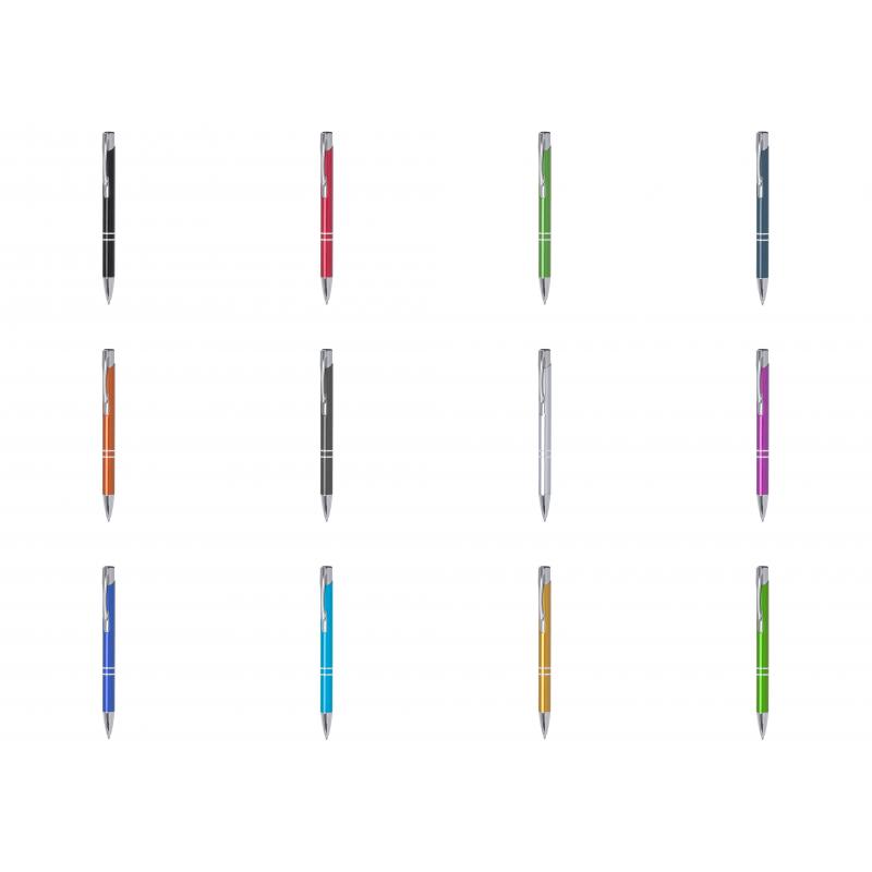 Original bolígrafo de mecanismo pulsador en elegante diseño bicolor. Con cuerpo troquelado en aluminio de suave acabado en variados colores. Original clip, anillas y punta en plateado. De cartucho jumbo y tinta azul.