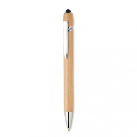 Bolígrafo pulsador con acabado de bambú con puntero táctil. Tinta azul.Recipiente :