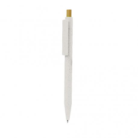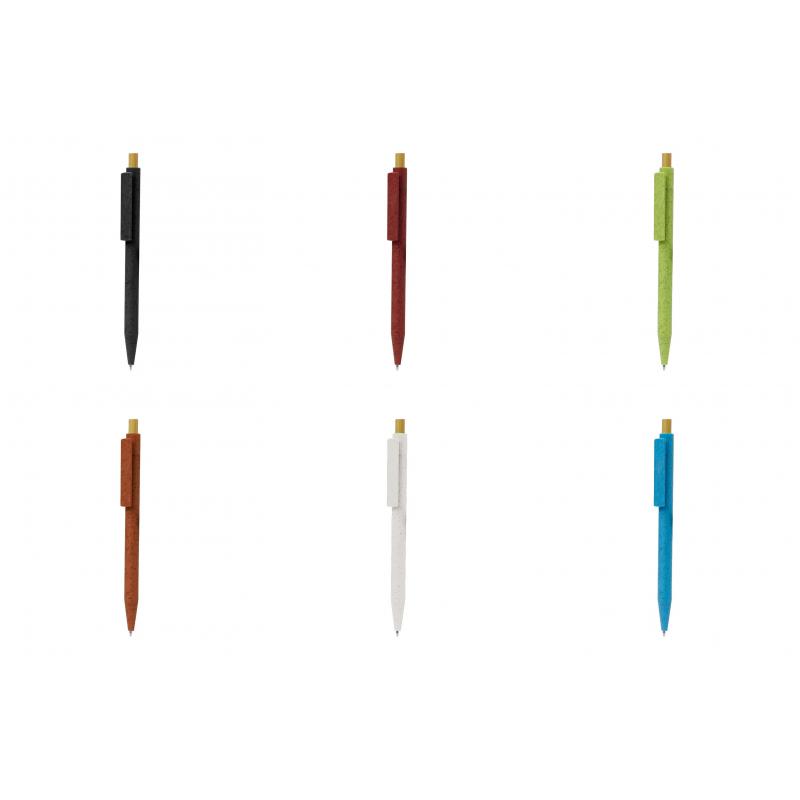 Bolígrafo fabricado con fibra de caña de trigo. Con cuerpo y clip a juego, de mecanismo pulsador fabricado en bambú y en tinta azul. Con distinguido logo de Caña de Trigo marcado en la caña. La Caña de Trigo fomenta la utilización de materias primas naturales, reduciendo así las emisiones contaminantes.