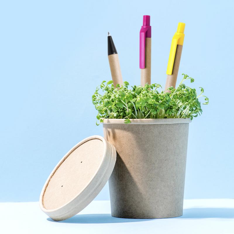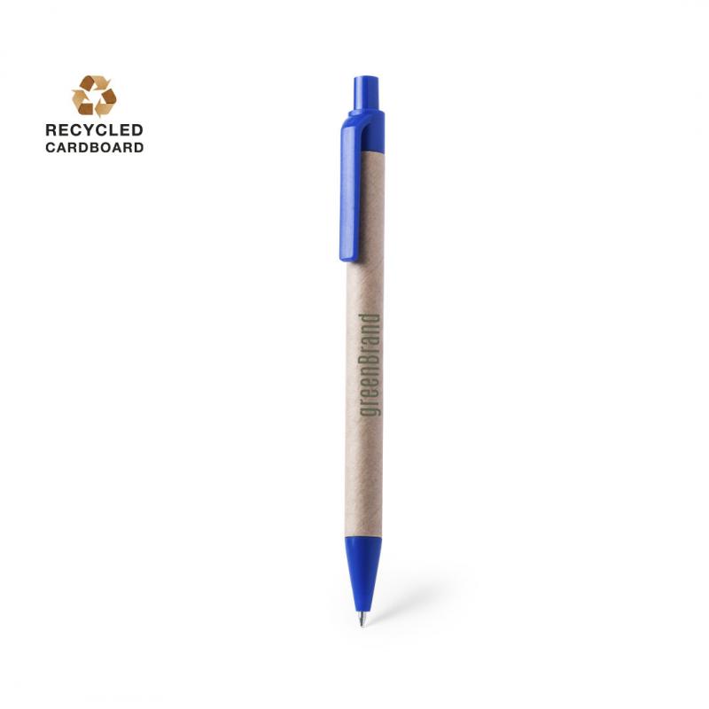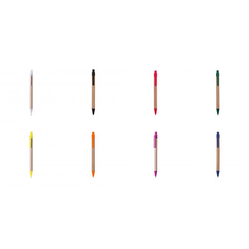 Bolígrafo de mecanismo pulsador en original combinación de cuerpo en cartón reciclado de color natural y accesorios en vivos colores. Tinta azul.