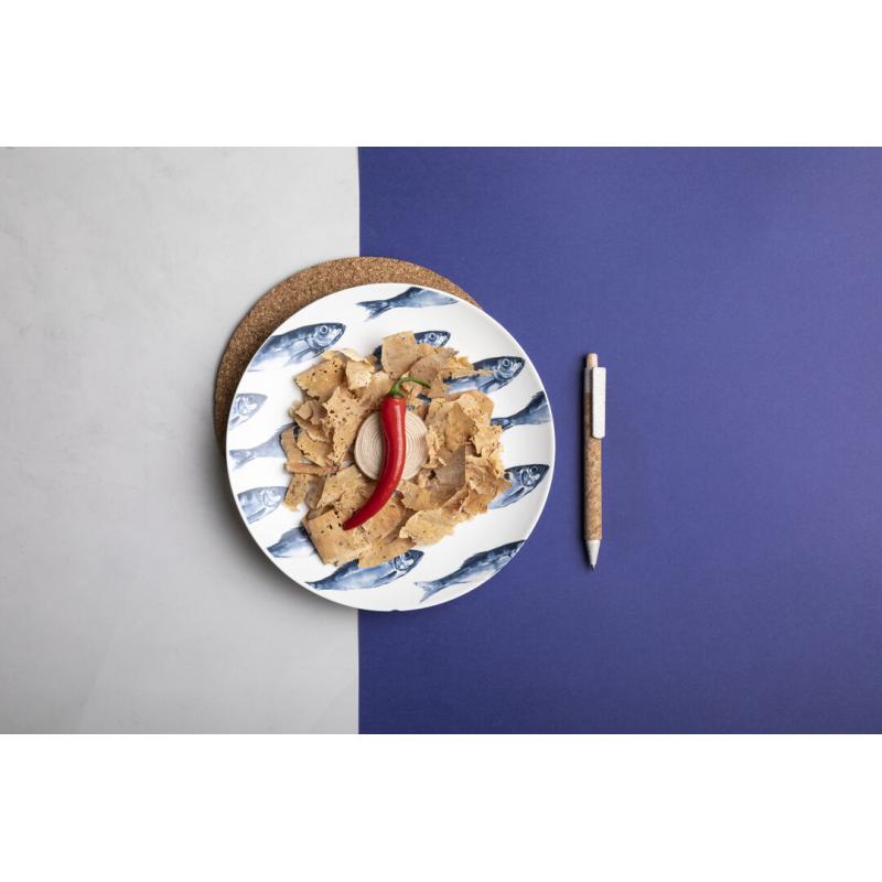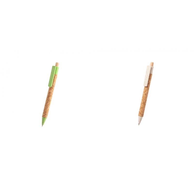 Bolígrafo de línea nature con cuerpo en corcho natural. Clip, punta y pulsador en caña de trigo, para así fomentar la utilización de materias primas naturales y reducir las emisiones de contaminantes. Con clip especialmente diseñado para marcaje en tampografía. De mecanismo pulsador y con tinta azul.