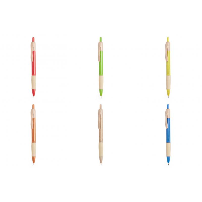 Bolígrafo de línea nature en caña de trigo, para así fomentar la utilización de materias primas naturales y reducir las emisiones contaminantes. Con empuñadura a juego, de mecanismo pulsador y con tinta azul. Disponible en variada gama de colores nature.