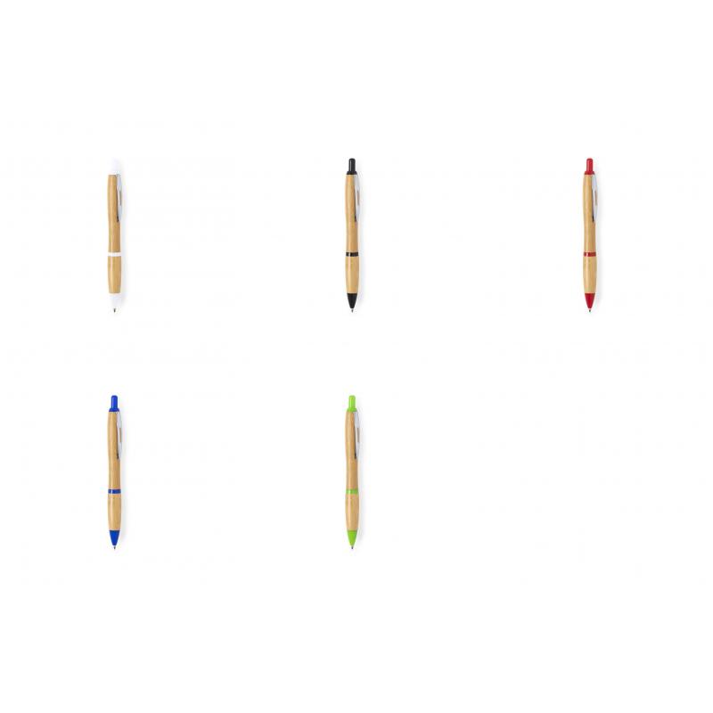Bolígrafo con mecanismo pulsador de línea nature, con cuerpo en bambú y detalles en variada gama de colores. Con original clip metálico troquelado y cómoda empuñadura de bambú. Tinta azul.