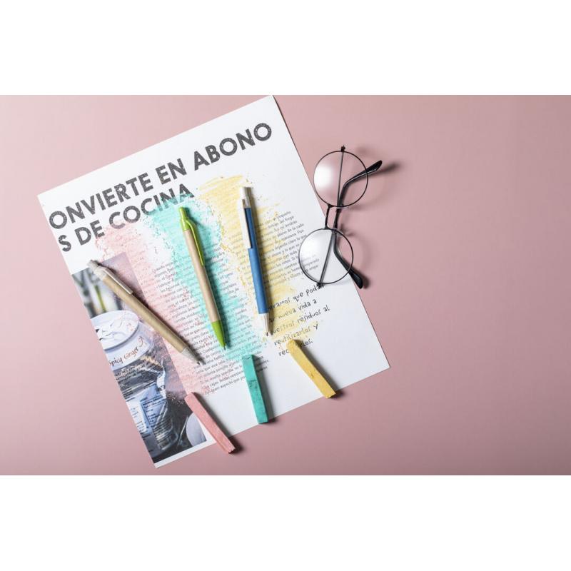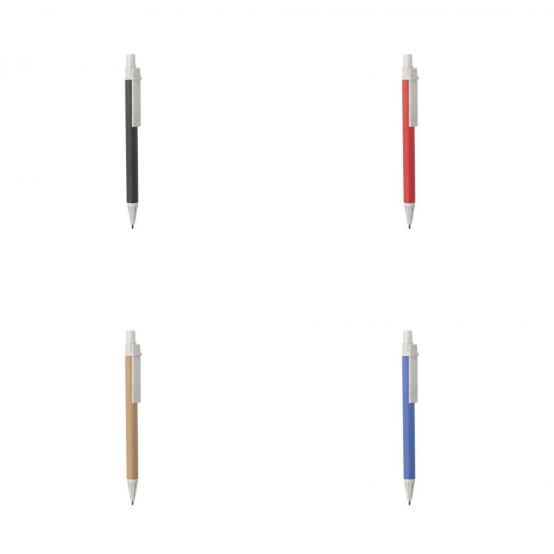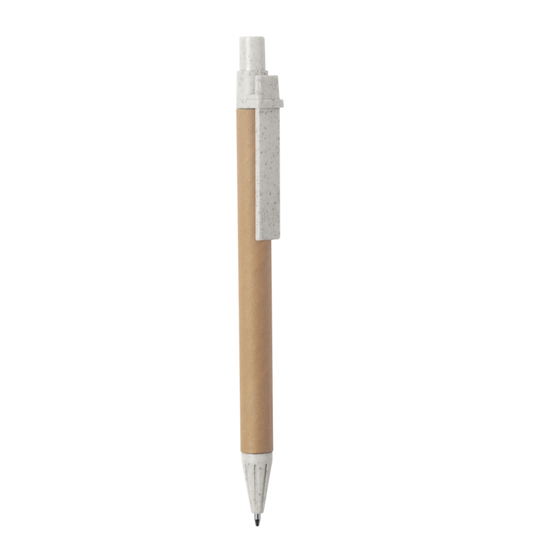 Bolígrafo con mecanismo pulsador de línea nature. Cuerpo en cartón reciclado, con accesorios en caña de trigo, para así fomentar la utilización de materias primas naturales y reducir las emisiones contaminantes. Disponible en variada gama de colores y en tinta azul.
