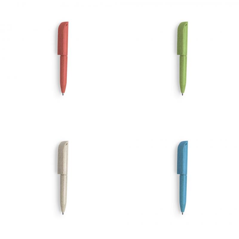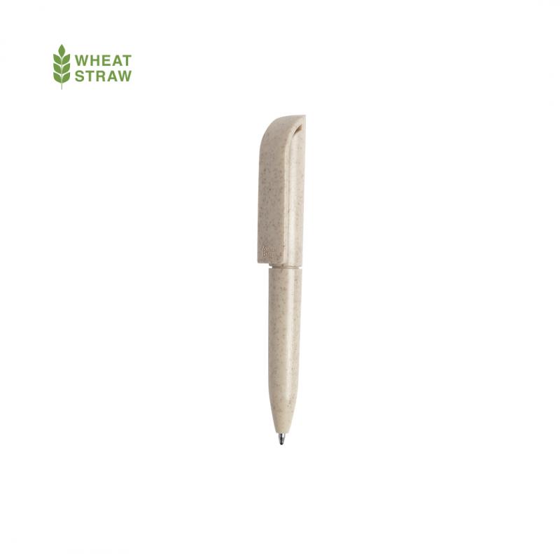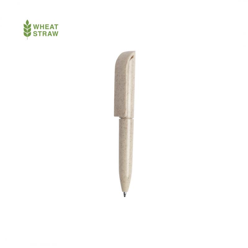 Minibolígrafo con mecanismo giratorio de línea nature. Cuerpo y accesorios en caña de trigo, para así fomentar la utilización de materias primas naturales y reducir las emisiones contaminantes. Disponible en variada gama de colores y en tinta azul.