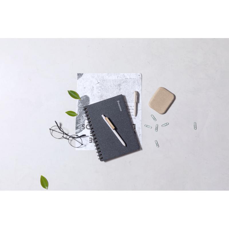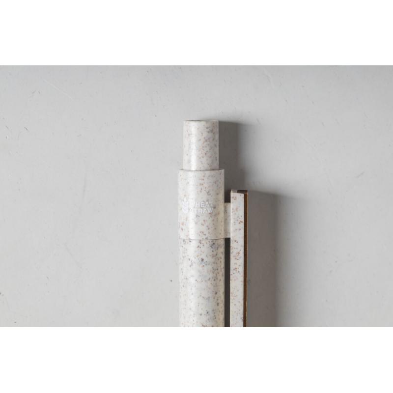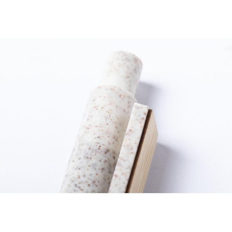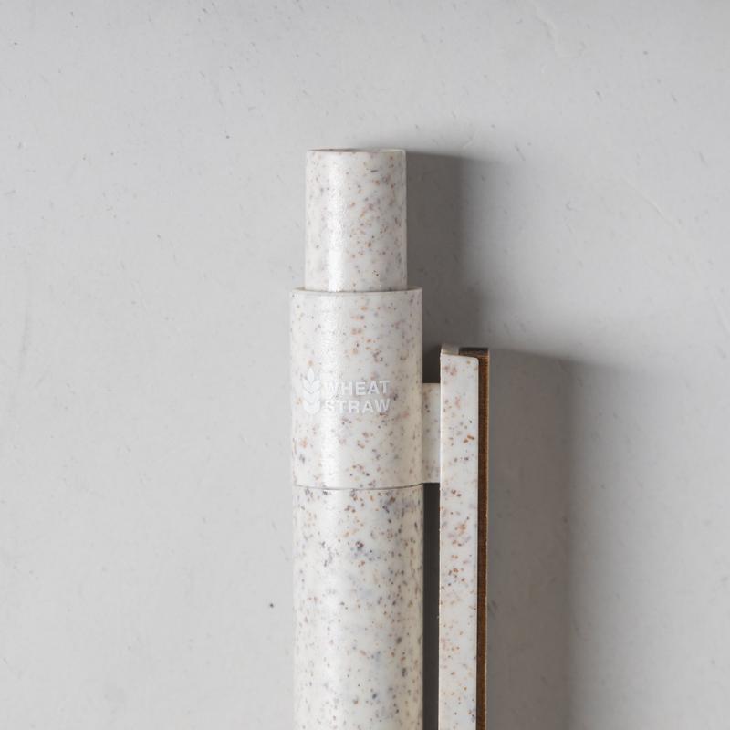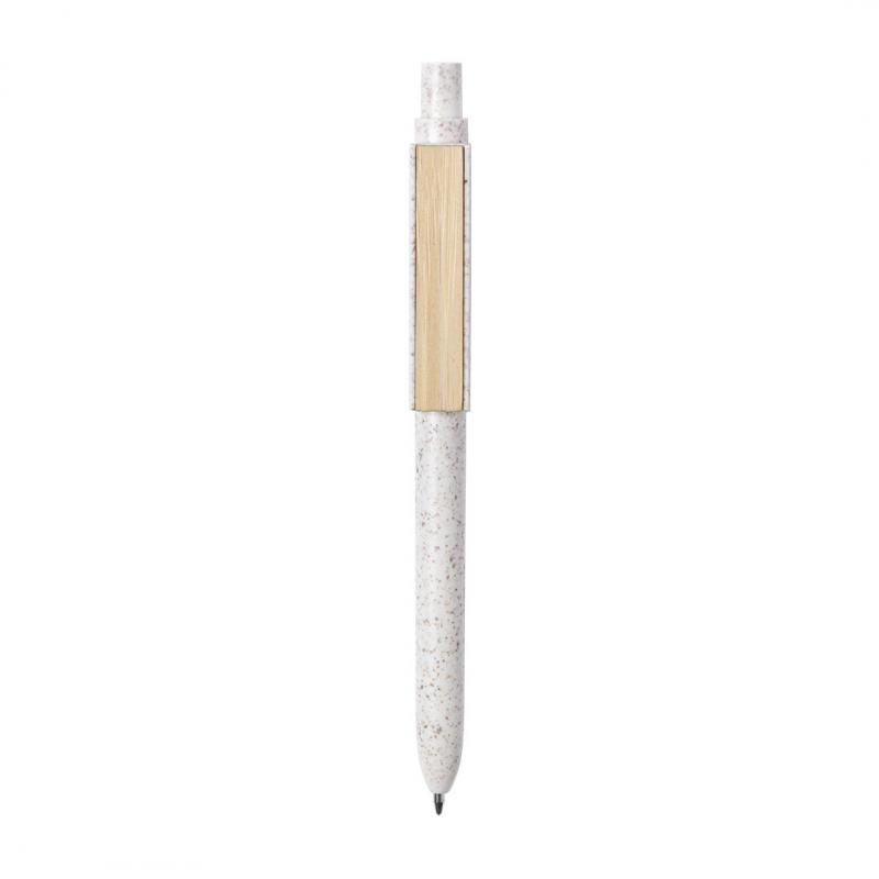 Bolígrafo de línea nature y mecanismo pulsador. Cuerpo fabricado en combinación de caña de trigo y clip en bambú, para así fomentar la utilización de materias primas naturales y reducir las emisiones contaminantes. Clip con amplia zona de marcaje y en tinta azul. Distintivo caña de trigo en la parte superior del bolígrafo.
