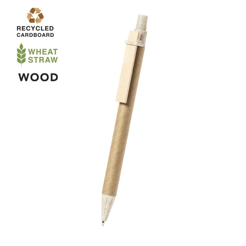 Bolígrafo de línea nature con mecanismo pulsador. Combinación de cuerpo en cartón reciclado de color natural, con punta y pulsador en caña de trigo y clip de madera, para así fomentar la utilización y reciclado de materias primas, reduciendo así las emisiones contaminantes. Tinta azul. Con distintivo Wheat Straw en la parte superior.