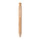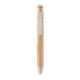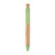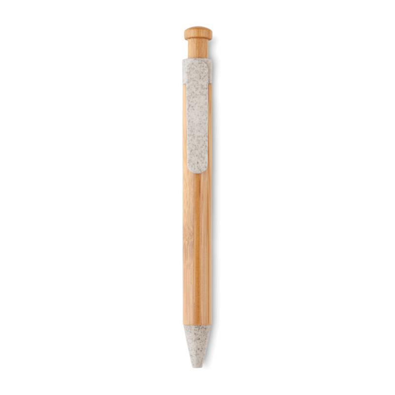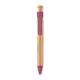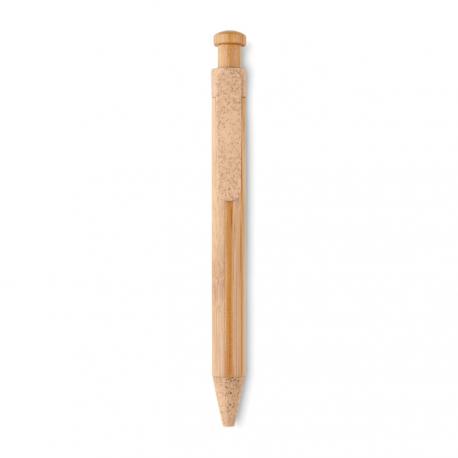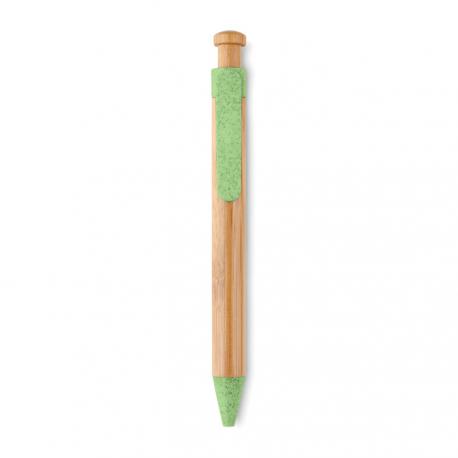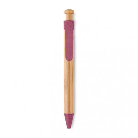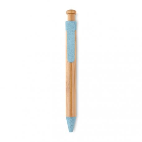 Bolígrafo de pulsador con cuerpo de bambú. Clips y punta de colores a juego fabricados en paja de trigo 50 % y ABS 50 %. Tinta azul.
