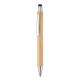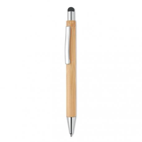 Bolígrafo pulsador de bambú con puntero táctil y acabado cromado brillante. Tinta azul. El bambú es un producto natural, puede haber ligeras variaciones en el color y el tamaño por artículo, lo que puede afectar el resultado final de la impresión.
