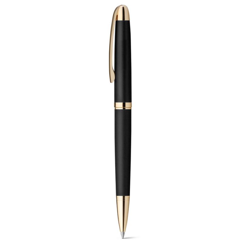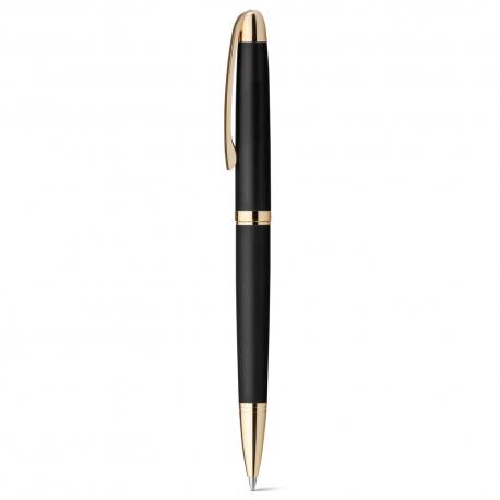 Bolígrafo metálico con mecanismo de giro con clip y detalles dorados. Se entrega en estuche de papel kraft. Escritura azulRecipiente :