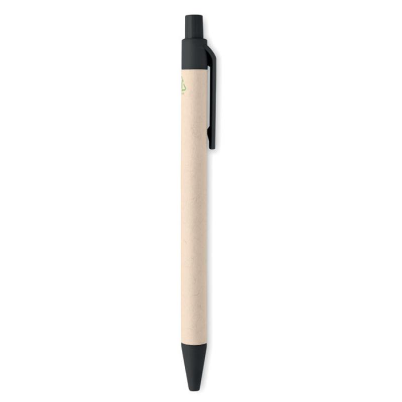 Bolígrafo con pulsador con cuerpo de cartón de leche reciclado y piezas de PLA (en maíz 100% biodegradable). Tinta azul.