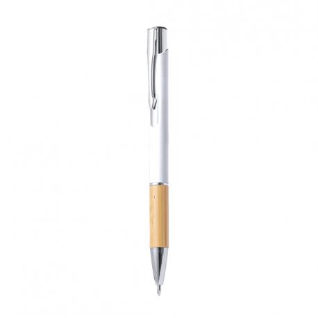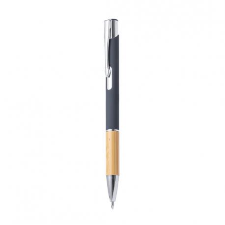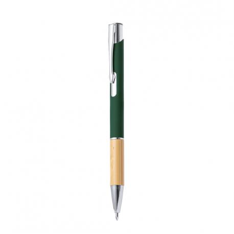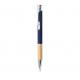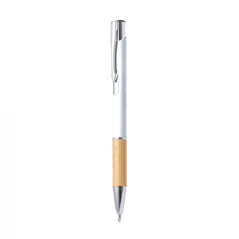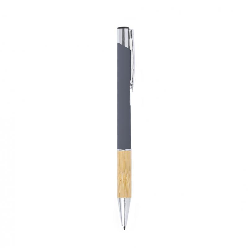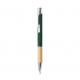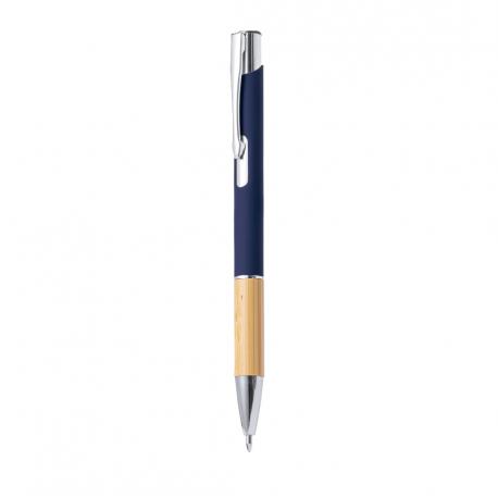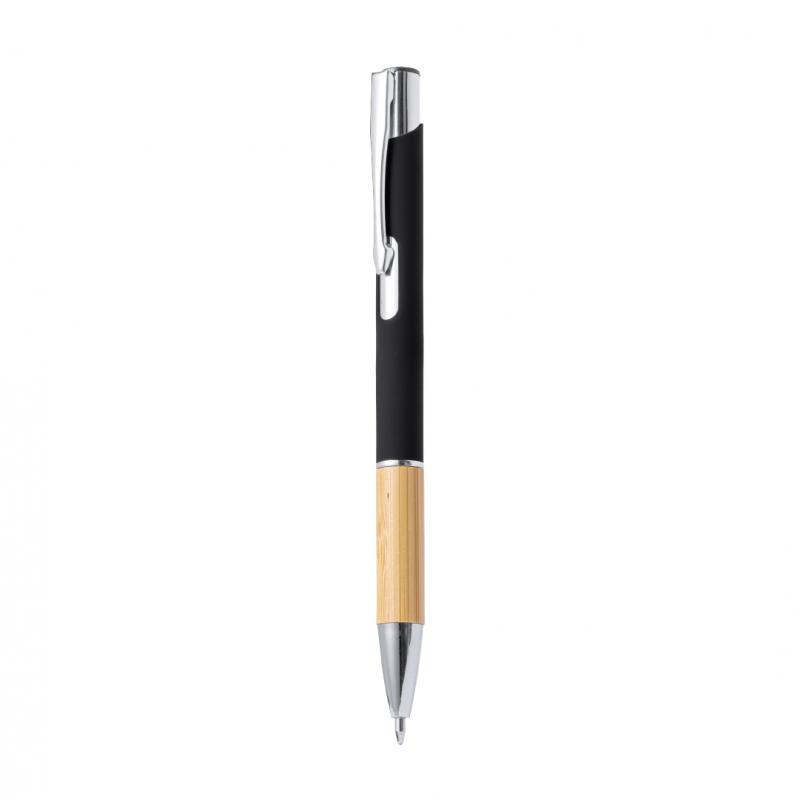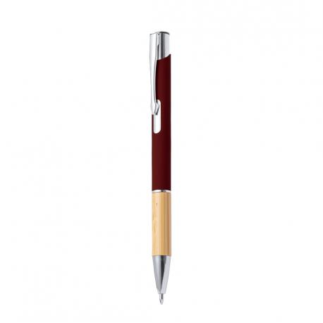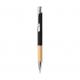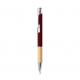 Elegante bolígrafo de línea nature y mecanismo pulsador. Cuerpo en resistente aluminio de acabado goma y empuñadura en bambú, con la caña en una amplia gama de distintivos colores. Clip metálico, con mecanismo pulsador y en tinta azul. Presentado en bolsa individual reciclada.