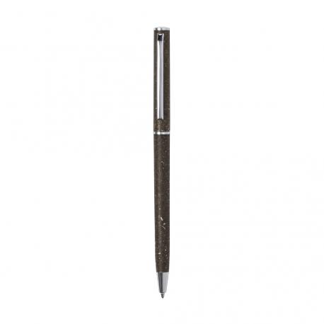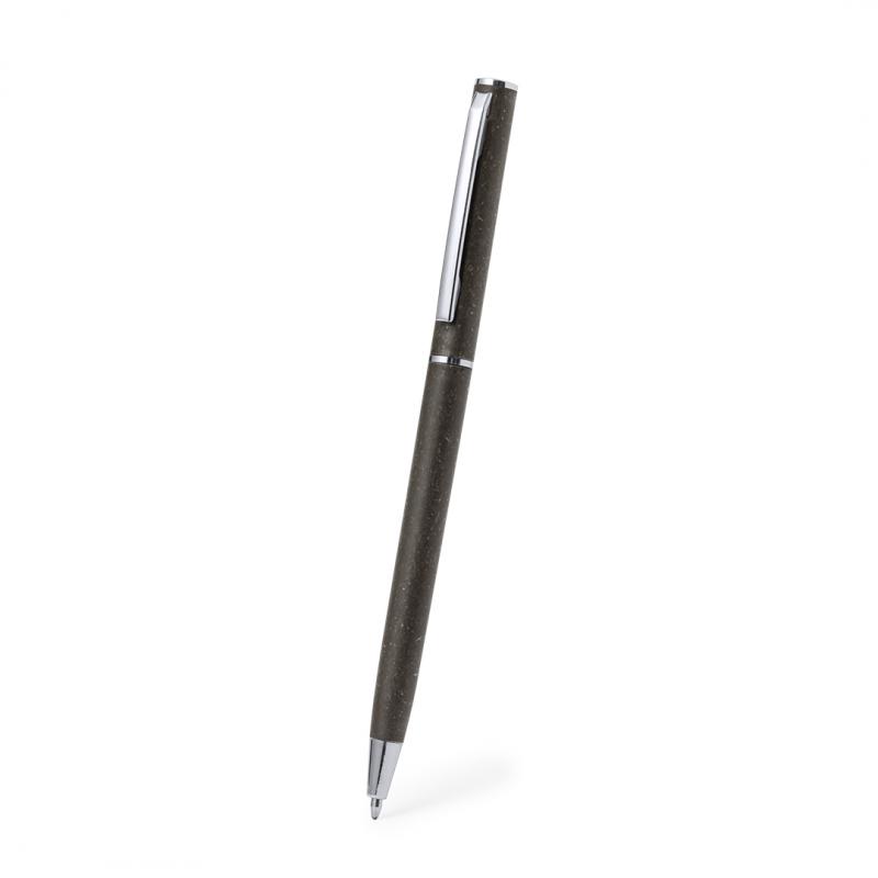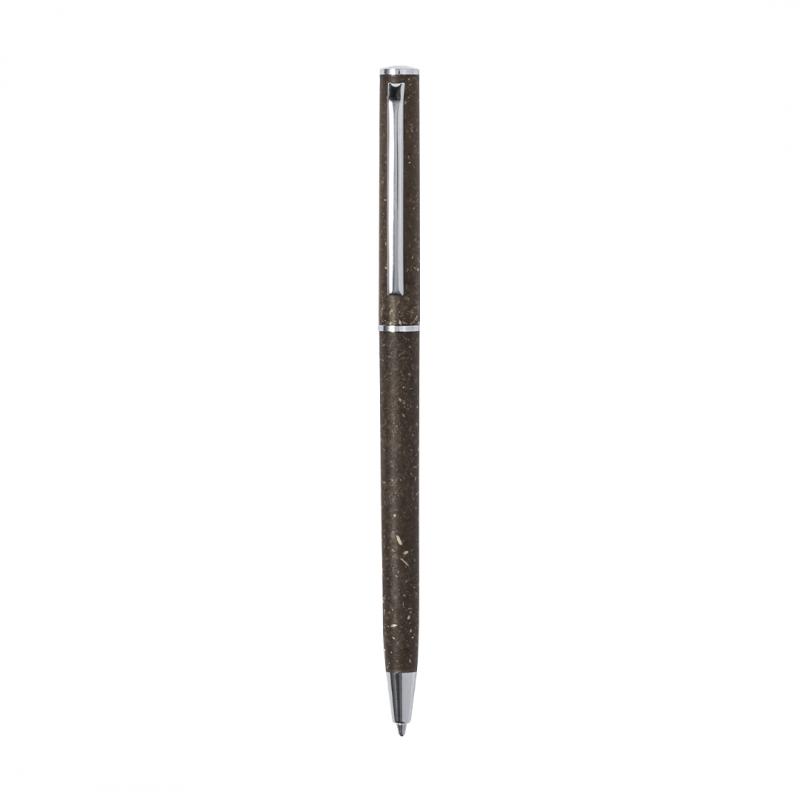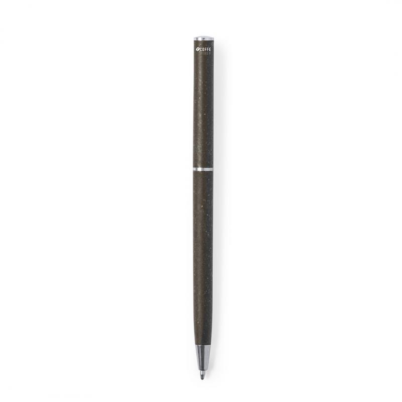 Bolígrafo con cuerpo en fibra de café. Clip metálico y accesorios cromados. De mecanismo giratorio y de tinta azul. Con logotipo fibra de café y disponible en color natural.La fibra de café es una solución circular que se obtiene de la utilización de los residuos producidos en la obtención del café. Una alternativa sostenible que favorece la reducción del uso de plásticos, ahorrando energía en su proceso de fabricación y contribuyendo al cuidado del medio ambiente.