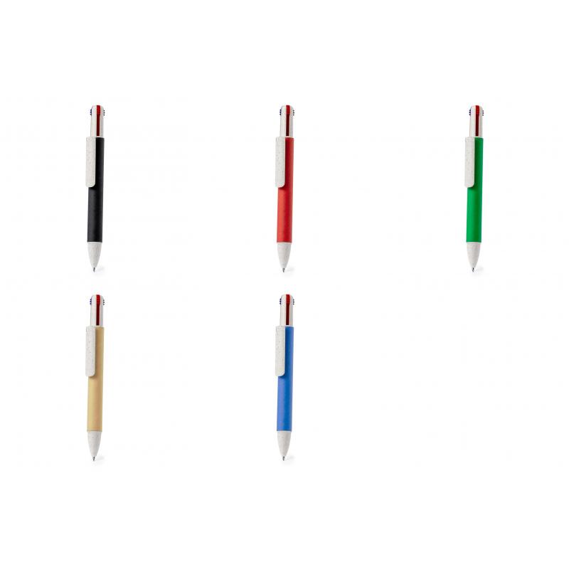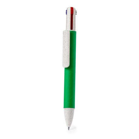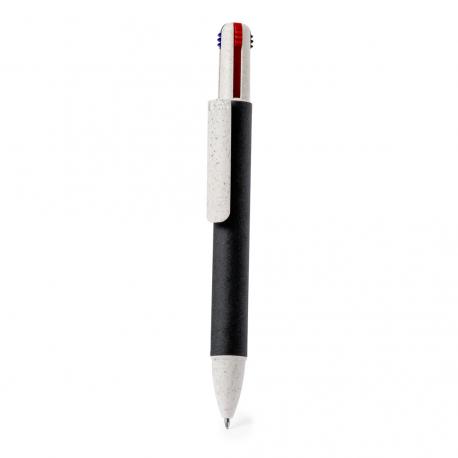 Bolígrafo 4 en 1 con mecanismo pulsador retráctil. Combinación de cuerpo en cartón reciclado natural y accesorios en caña de trigo y ABS, para fomentar la utilización y reciclado de materias primas, reduciendo así las emisiones contaminantes. De 4 cartuchos en tinta azul, roja, negra y verde.El cartón reciclado proviene del reaprovechamiento de excedente de fabricaciones y reciclaje de papel en el final de su vida útil, convirtiéndose en un lienzo ecológico y sostenible.
