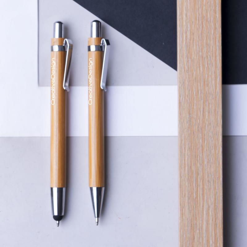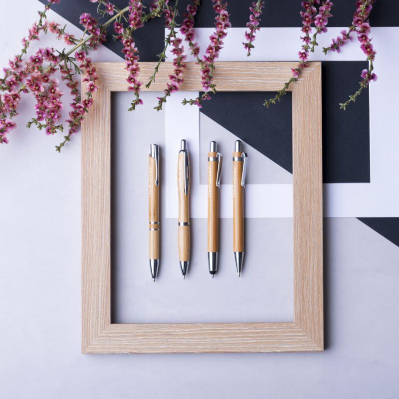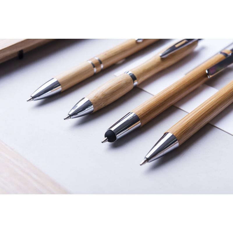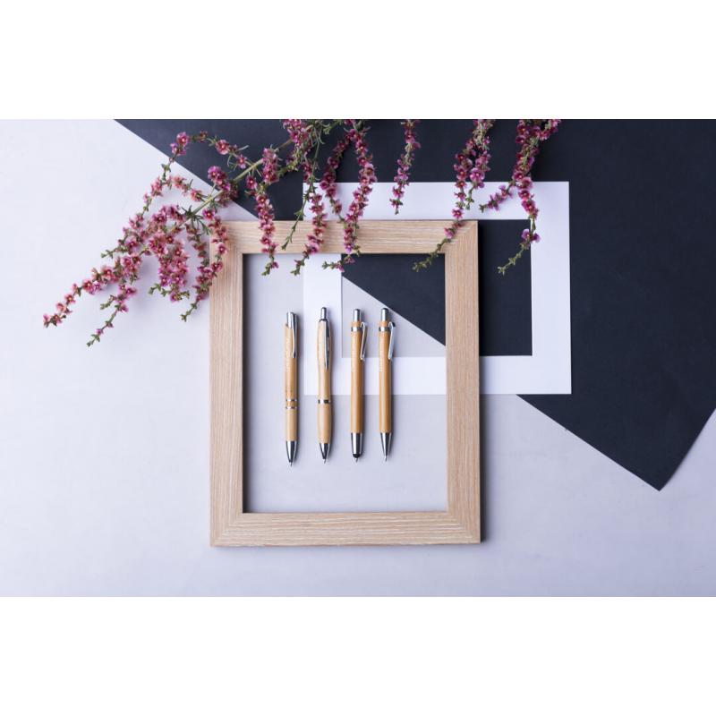 Elegante bolígrafo puntero de mecanismo pulsador con cuerpo en madera de bambú natural y accesorios de acabado metálico en color plateado brillante. De cartucho jumbo y tinta azul.