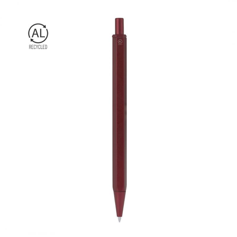 Elegante bolígrafo fabricado en Aluminio Reciclado. Cuerpo en distinguida forma hexagonal. De mecanismo pulsador fabricado en ABS Reciclado y de tinta azul. Con distinguido logo de Aluminio Reciclado marcado en la caña.El Aluminio Reciclado es un material con posibilidades de reciclaje casi infinitas, sin perder sus propiedades originales y consumiendo menos energía en este proceso.Certificación GRS (Global Recycled Standard / Estándar de Reciclaje Global), que garantiza el origen reciclado del material usado para fabricar el producto.El RABS es un plástico altamente reciclable de gran resistencia y con multitud de aplicaciones que lo convierten en una solución eco-friendly. Con certificación RCS, que garantiza el origen reciclado del mismo y con logo RABS grabado.