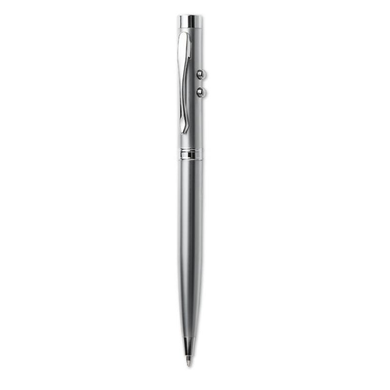 Bolígrafo multifuncional. Tinta azul, luz LED blanca y luz del puntero láser clase II de color rojo. Incluye 3 pilas de botón. Presentado en caja de madera.