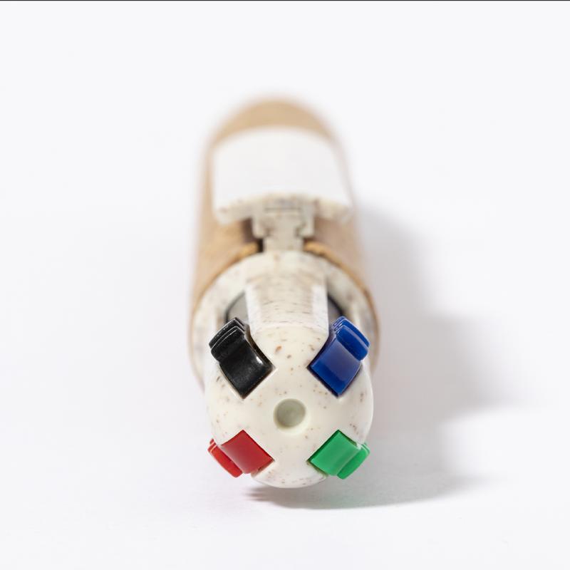 Bolígrafo 4 en 1 con mecanismo pulsador retráctil. Combinación de cuerpo en corcho natural y accesorios en caña de trigo y ABS, para fomentar la utilización y reciclado de materias primas, reduciendo así las emisiones contaminantes. De 4 cartuchos en tinta azul, roja, negra y verde.Elaborado con elementos vegetales para así fomentar la utilización de materias primas naturales y reducir las emisiones contaminantes.