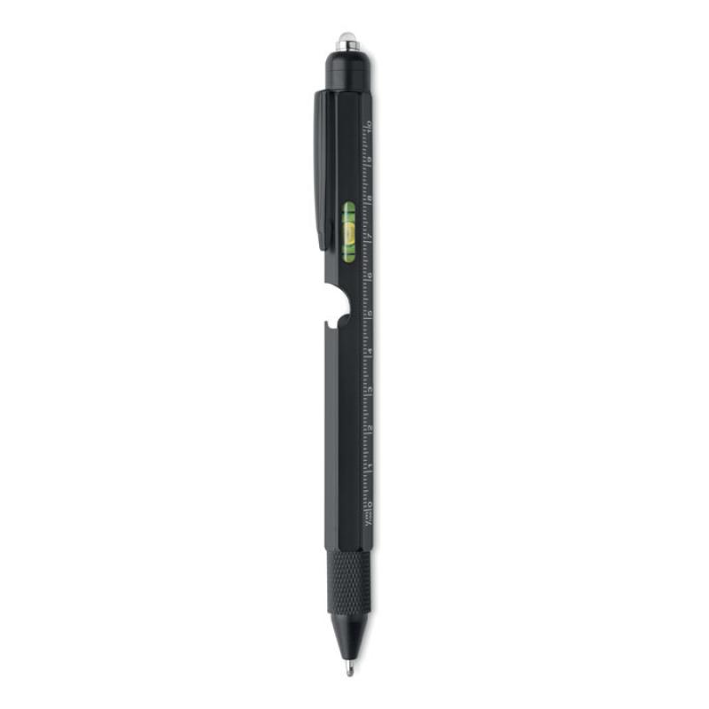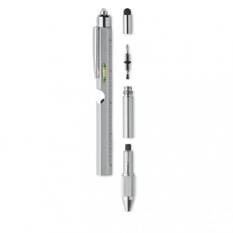 Bolígrafo giratorio de acero inoxidable con nivel de burbuja y regla 10 cm, puntero táctil y puntas de destornillador de cabeza Phillips y plana y LED. 3 pilas AG incluidas. Tinta azul.Recipiente :