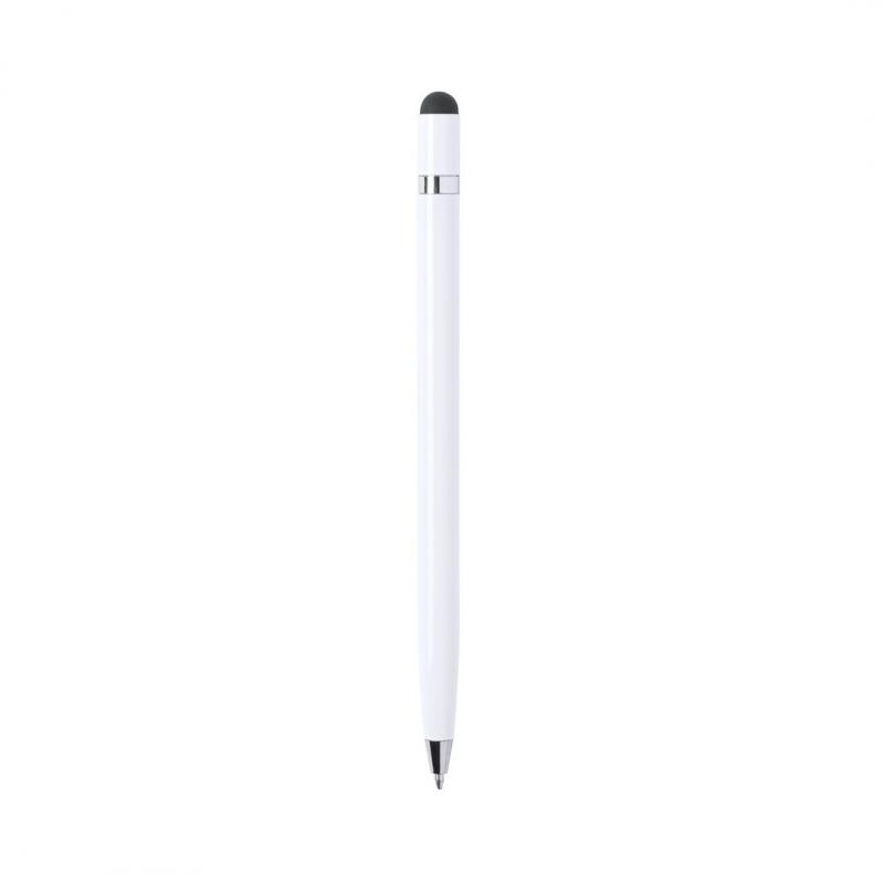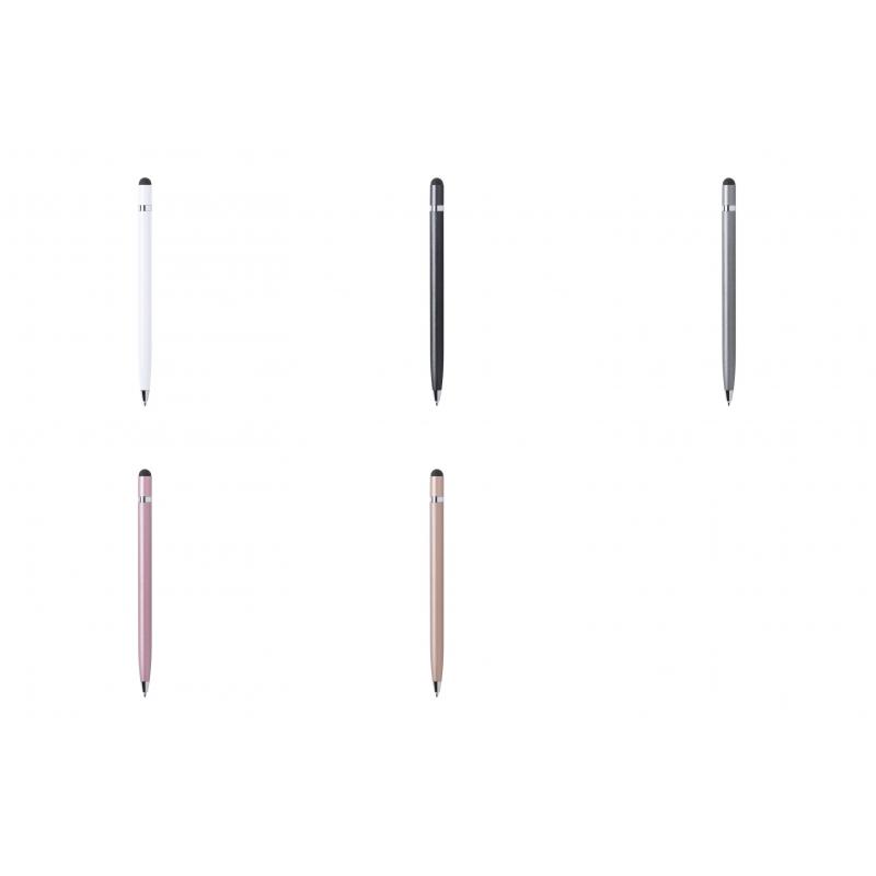 Bolígrafo puntero de mecanismo giratorio con cuerpo en aluminio de suave acabado metalizado. Con anilla cromada. Colores dorado, rosa, plateado y grafito con acabado brillo y color blanco con acabado mate. Tinta azul.