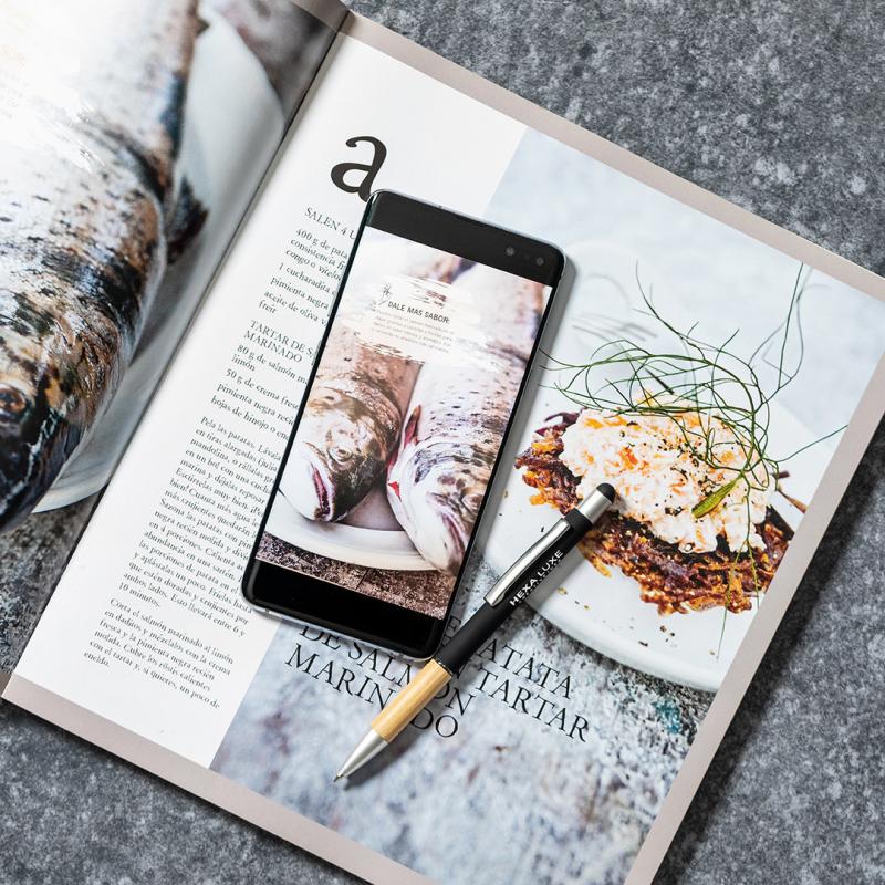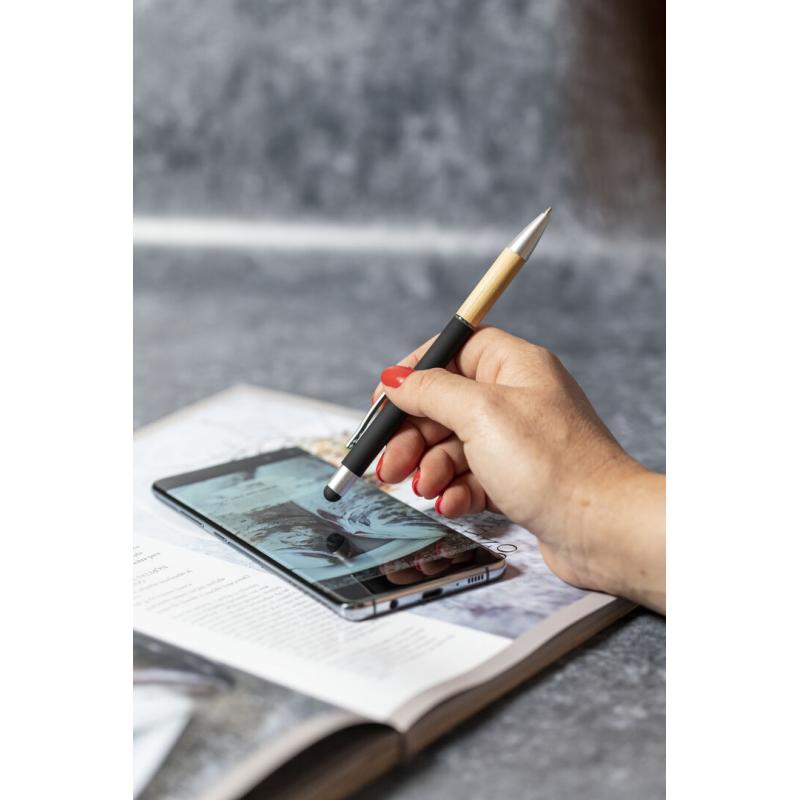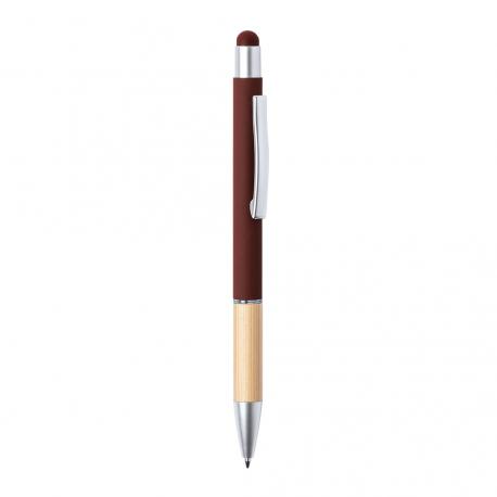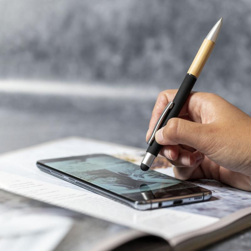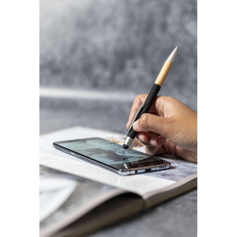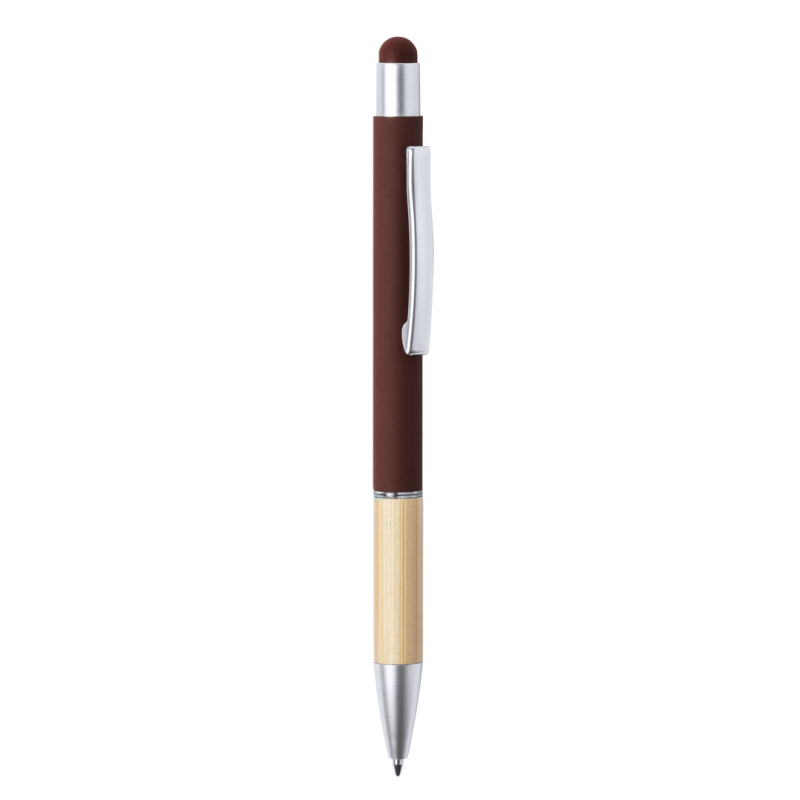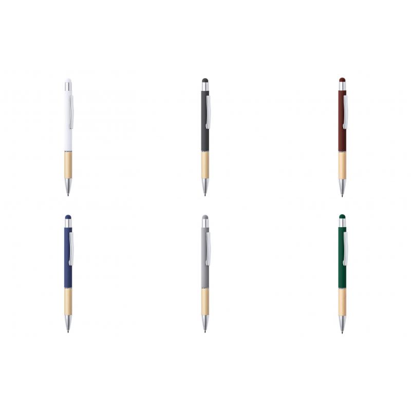 Bolígrafo puntero de línea nature y mecanismo pulsador. De elegante diseño, con cuerpo en aluminio de acabado mate y empuñadura en bambú, con accesorios en acabado mate. Clip metálico y anilla transparente, en tinta azul. Disponible en variada gama de colores.