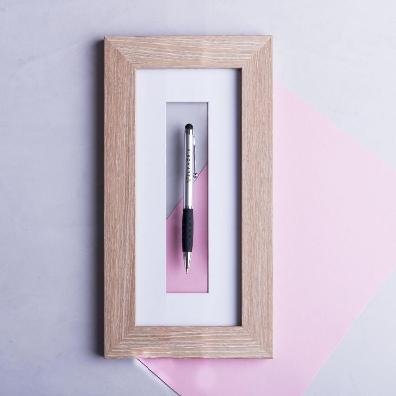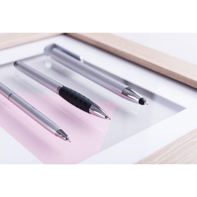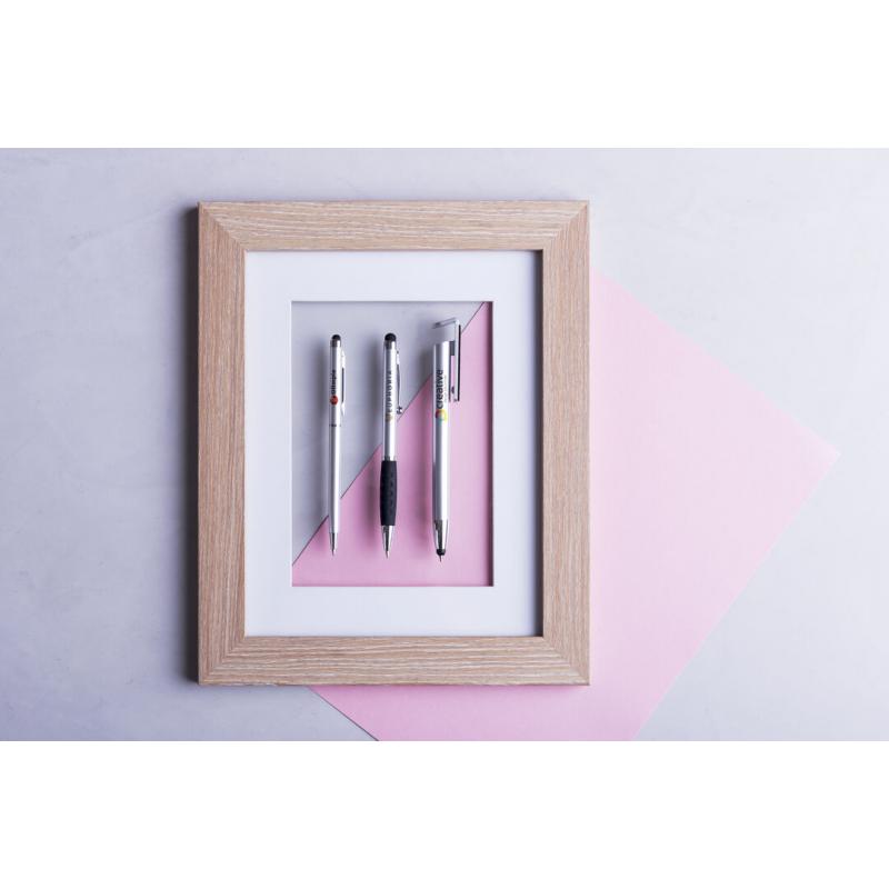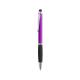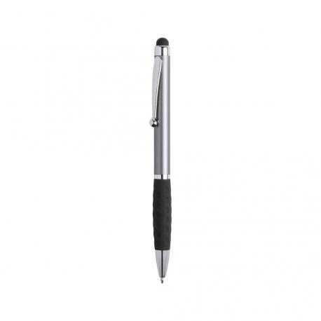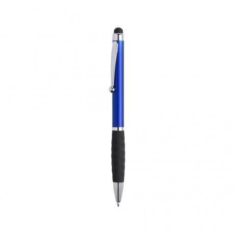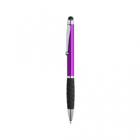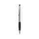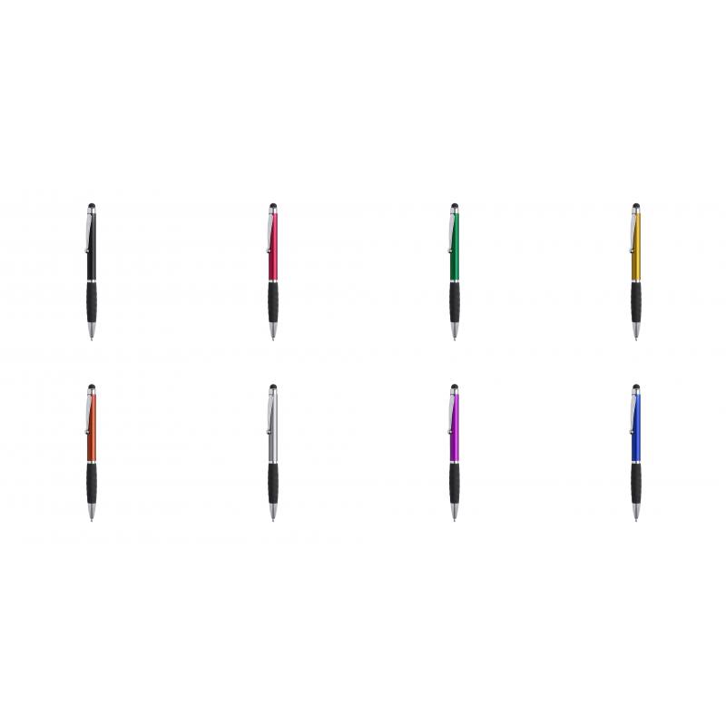 Bolígrafo puntero de mecanismo giratorio de elegante diseño bicolor con accesorios en color plateado brillante y cuerpo de suave acabado en llamativos colores metalizados brillantes. Con clip metálico y anilla a juego. Suave empuñadura de original diseño y tinta azul.