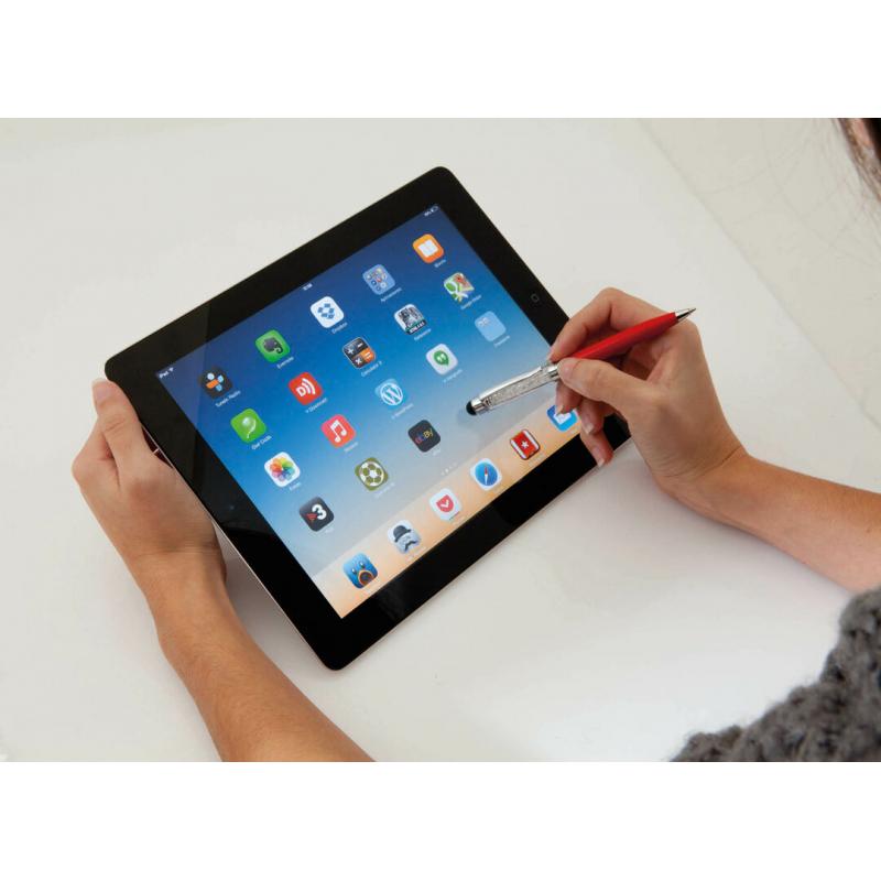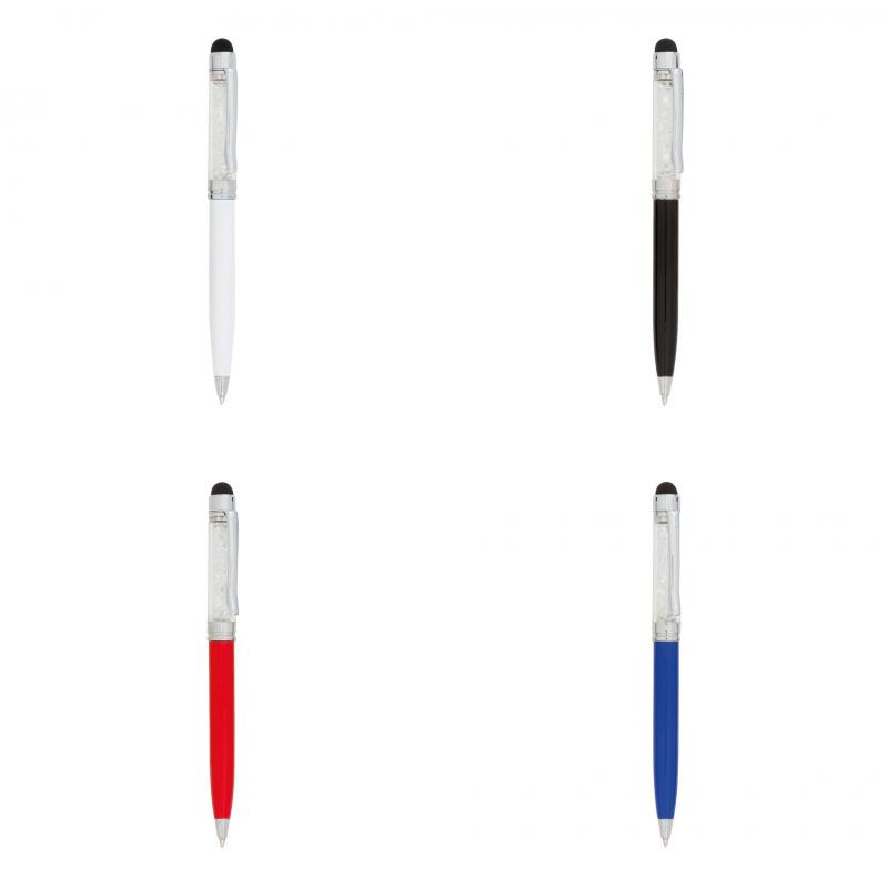 Original bolígrafo puntero de mecanismo giratorio con divertido líquido burbujeante en parte superior. Cuerpo metálico en suave acabado de vivos colores y accesorios en color plateado brillante. En tinta azul.