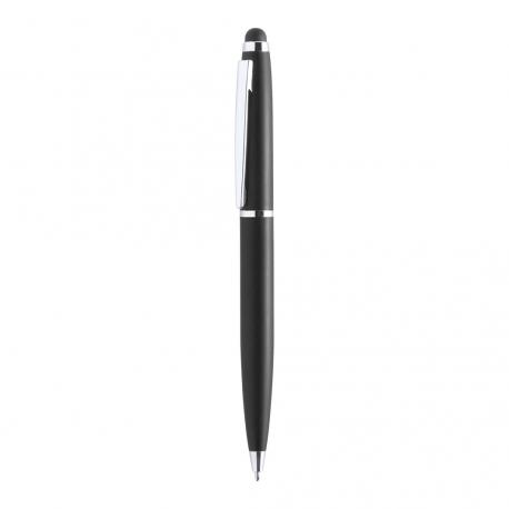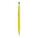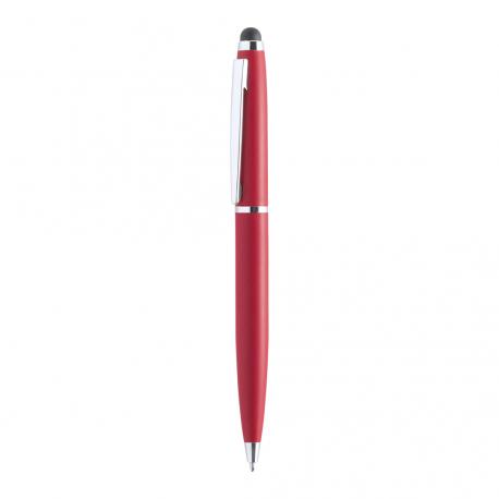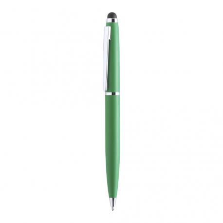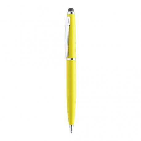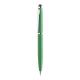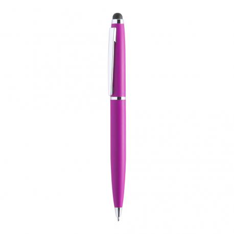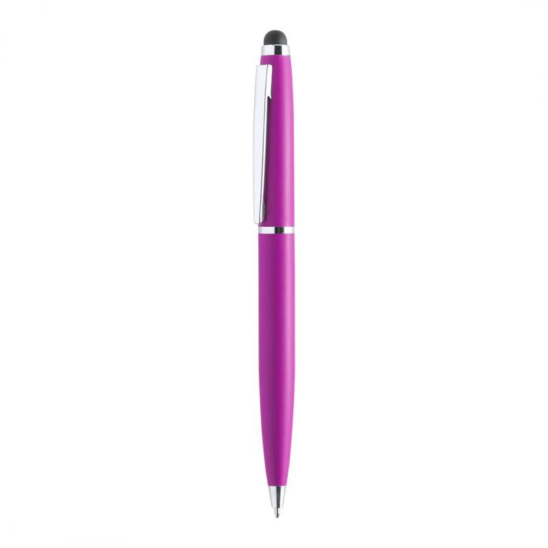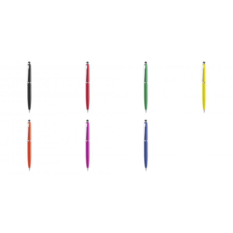 Bolígrafo puntero de mecanismo giratorio con cuerpo metálico de suave acabado en alegres colores. Accesorios y anillas en color plateado. Tinta azul.