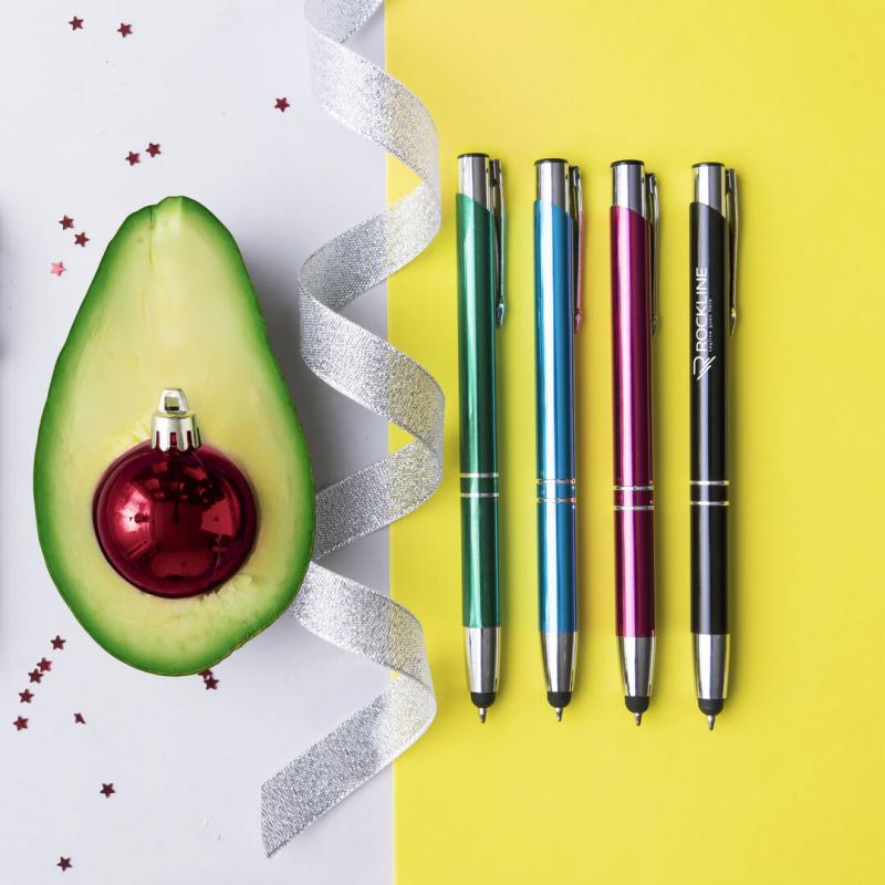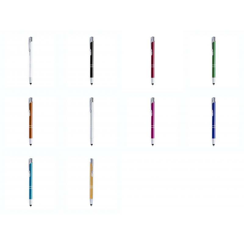 Bolígrafo puntero de mecanismo pulsador en divertidos colores. Acabado en aluminio brillante, de cartucho jumbo y tinta azul.