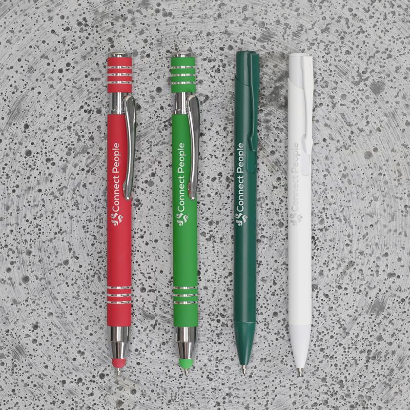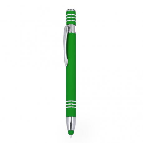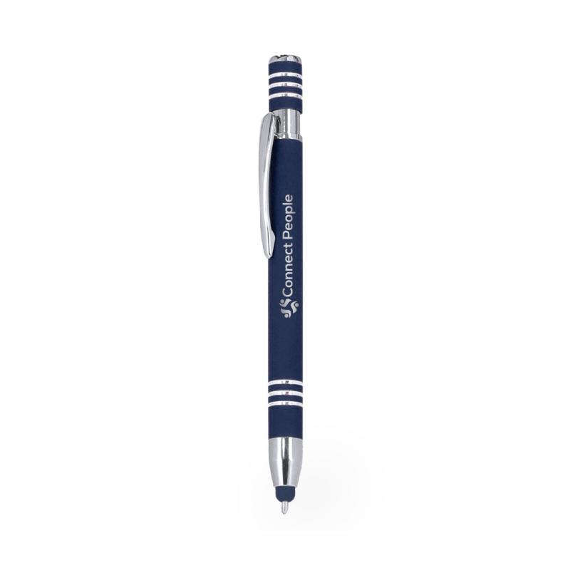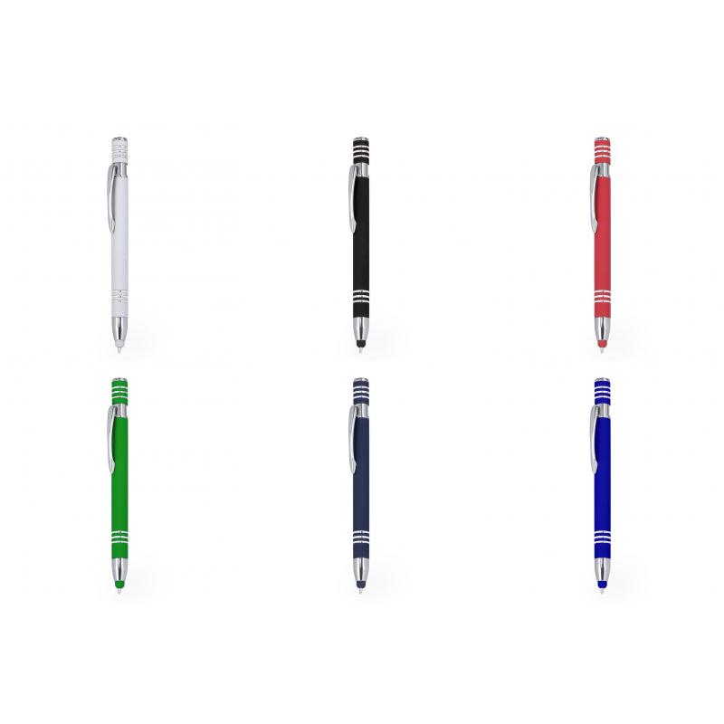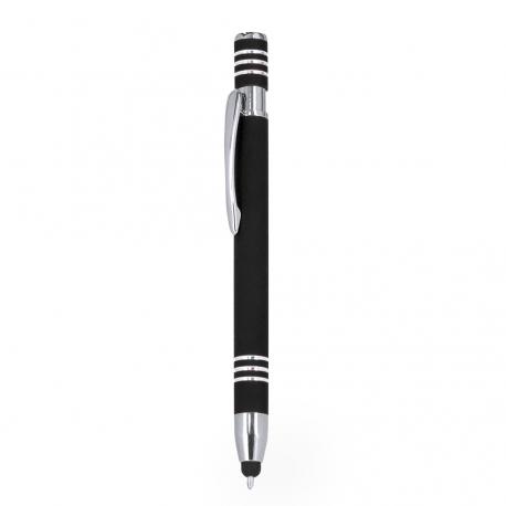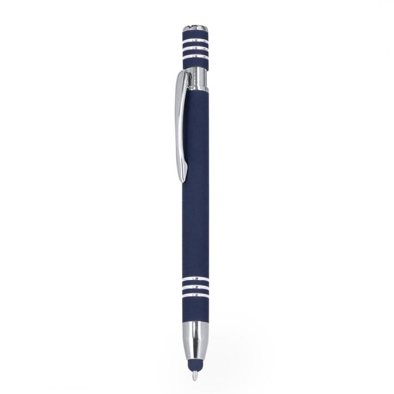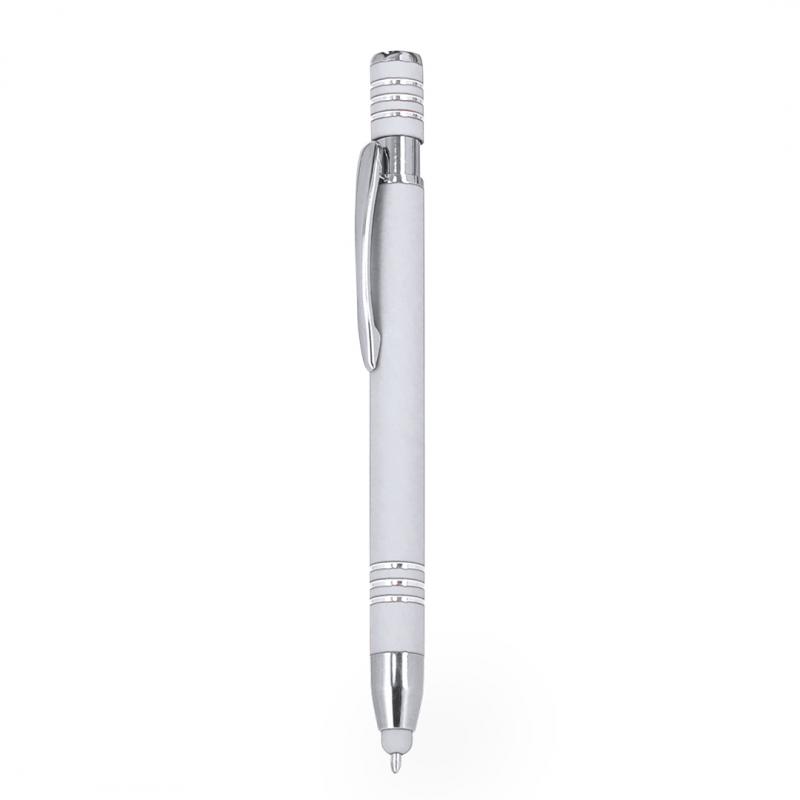 Bolígrafo puntero con mecanismo pulsador, fabricado en aluminio. Cuerpo con acabado de caucho, efecto gomoso. Especialmente diseñado para el marcaje a láser, revelando el logotipo en tono plateado. Incluye accesorios cromados y clip a juego. Tinta azul.