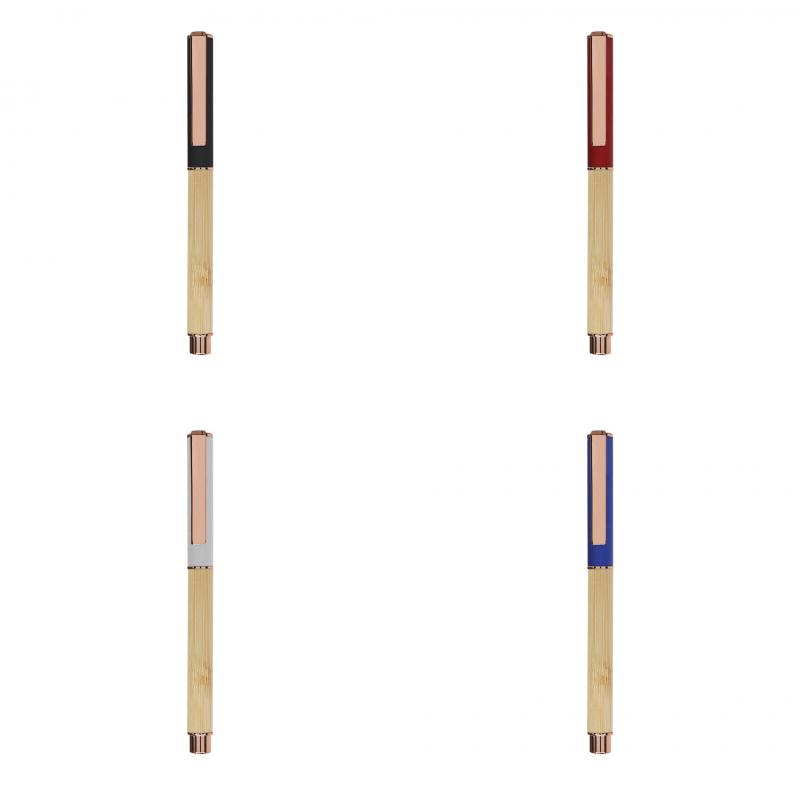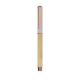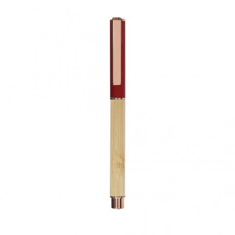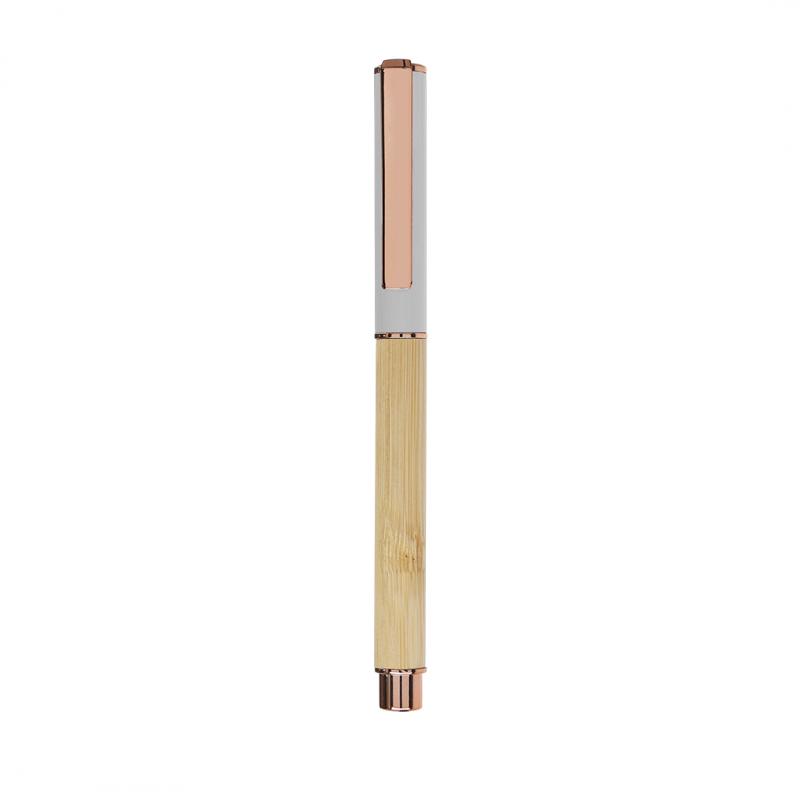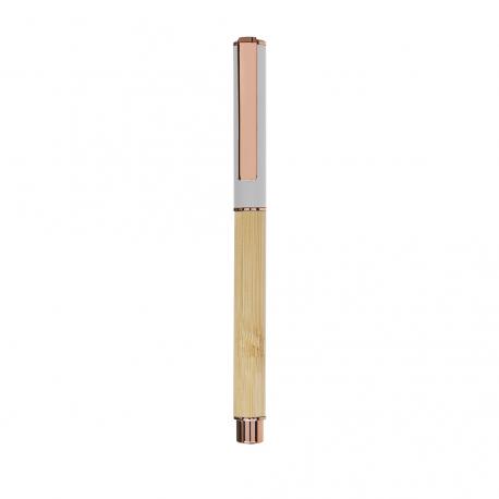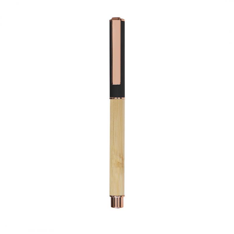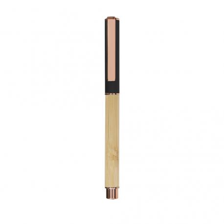 Elegante roller fabricado en bambú y aluminio. Con clip metálico, empuñadora y detalles de acabado oro rosa, caña fabricada en bambú y tapadera en aluminio. Con cartucho jumbo, en tinta azul y con cierre de capucha.