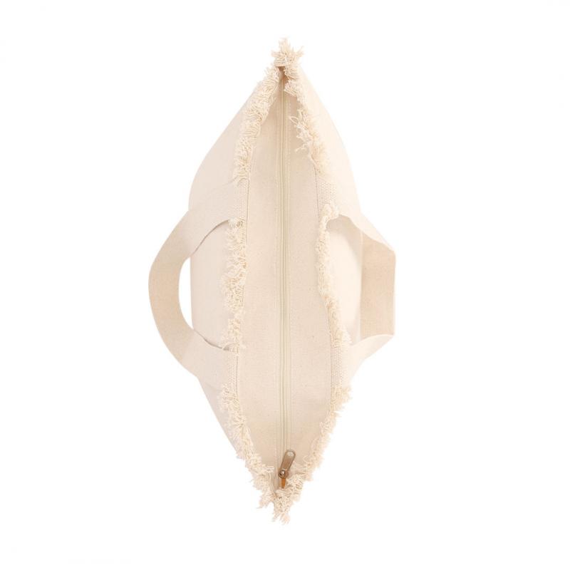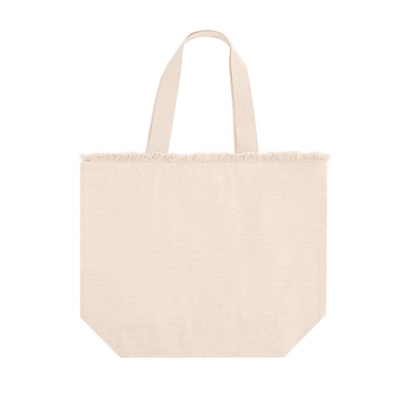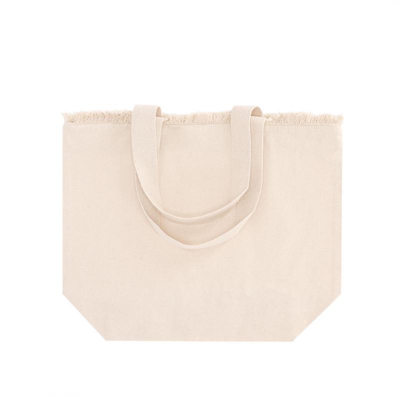 Bolsa con estilo flecos confeccionada principalmente en algodón de 320 g/m2. De práctico y moderno diseño, incorpora asas largas reforzadas. Incluye cierre de cremallera para mayor seguridad.