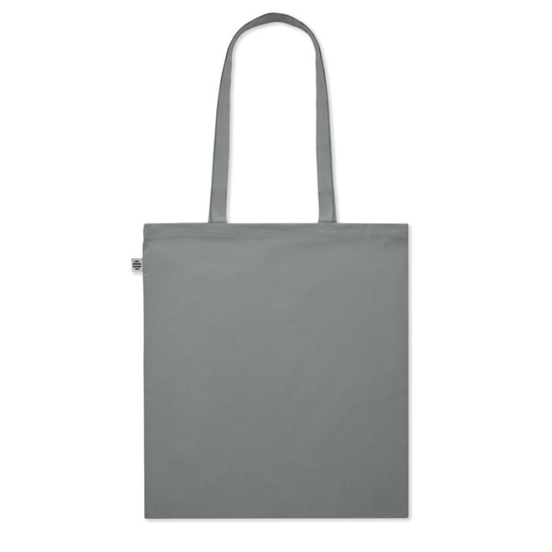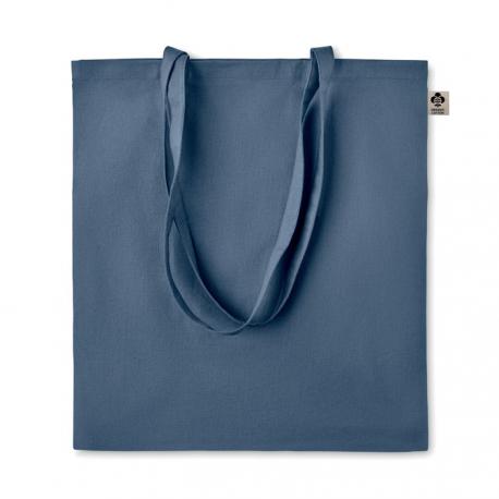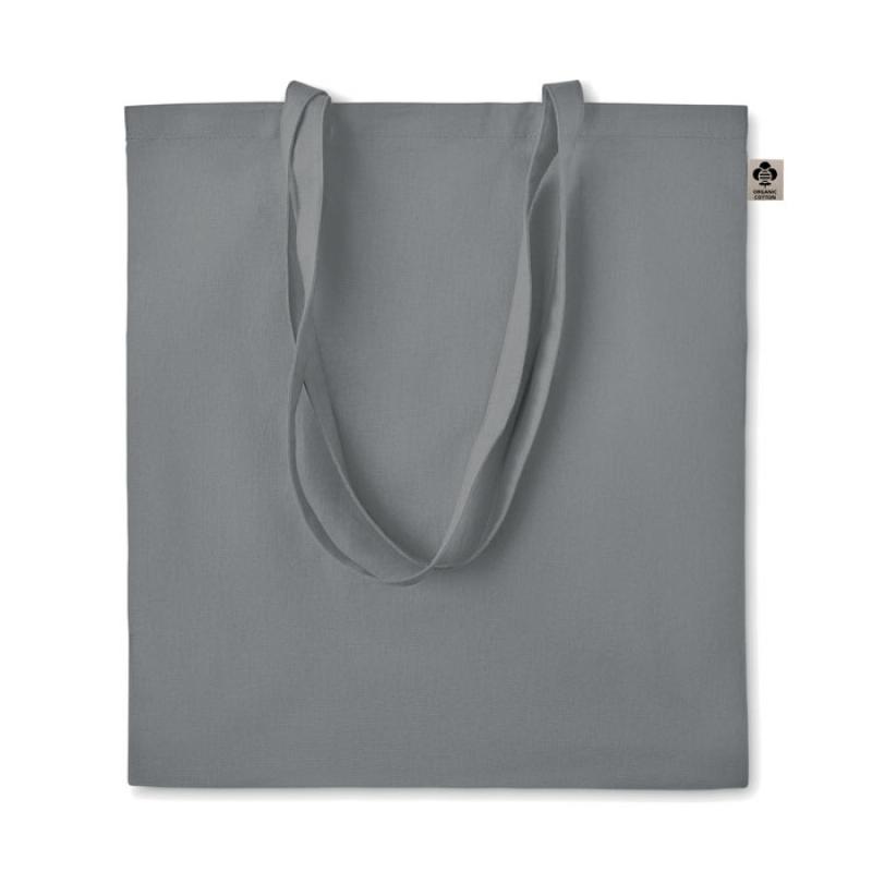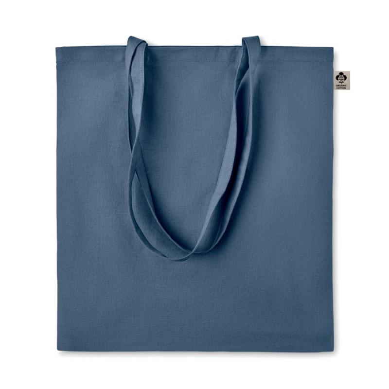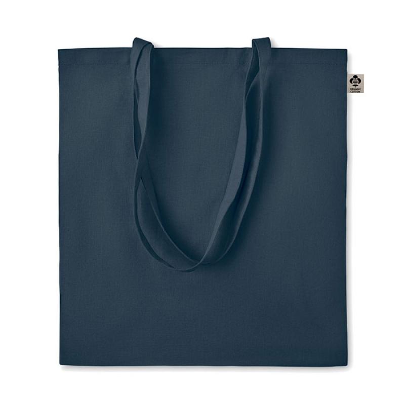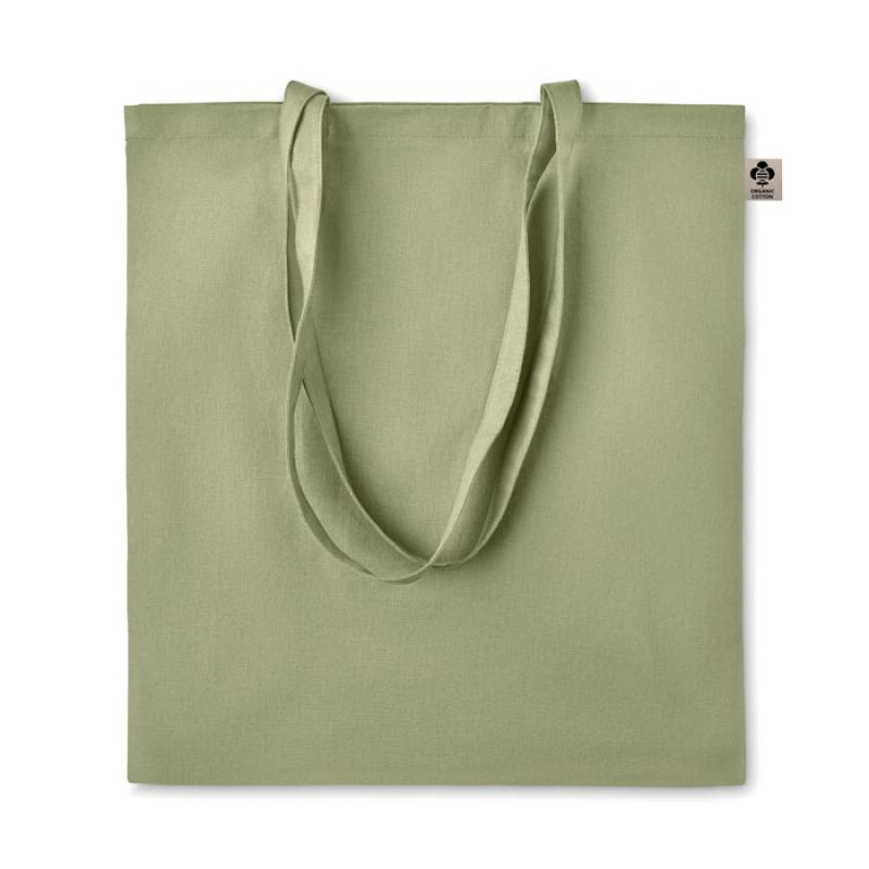 Bolsa de la compra de algodón orgánico con asas largas. 140 gr/m². Producido bajo certificado estándar para controlar el uso de sustancias nocivas en textil.