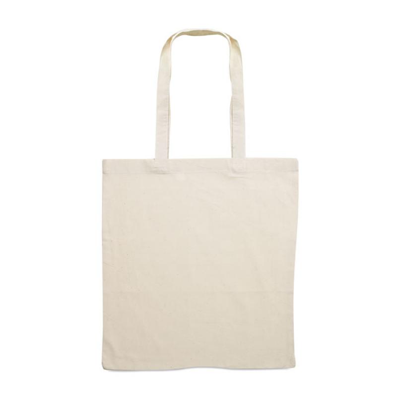 Bolsa de la compra de algodón con asas largas. 180 gr/m². Producido bajo certificado estándar para controlar el uso de sustancias nocivas en textil.