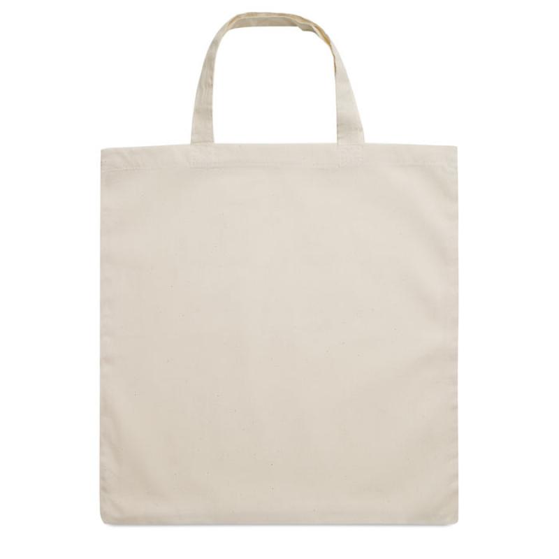 Bolsa de la compra de algodón con asas cortas. 140gr/m². Producido bajo certificado estándar para controlar el uso de sustancias nocivas en textil.
