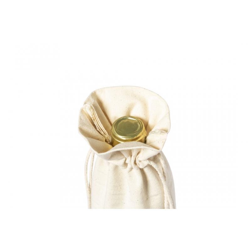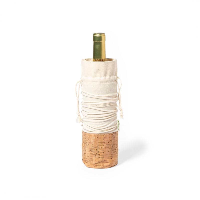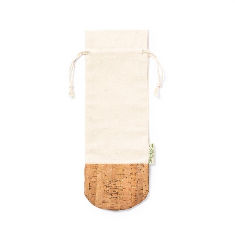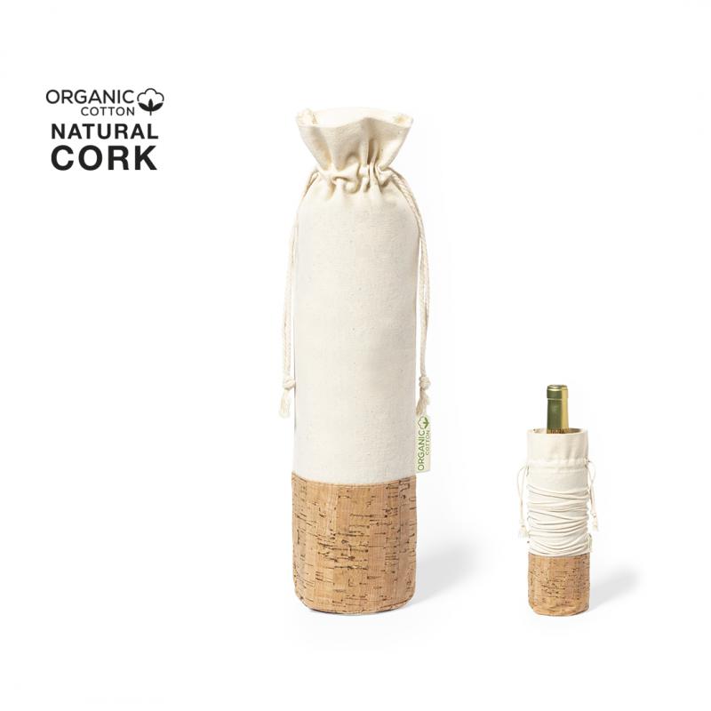 Bolsa para botellas de línea nature. Fabricada en algodón orgánico 100%, con cierre de cordón y base en corcho natural. Ideal para botellas de 750 ml.