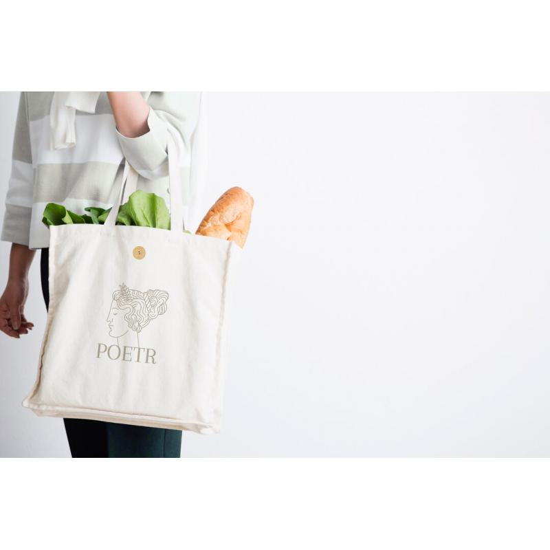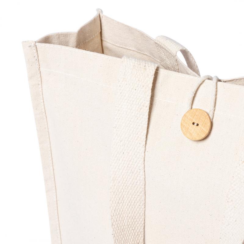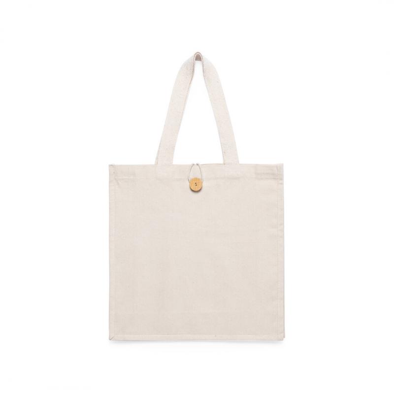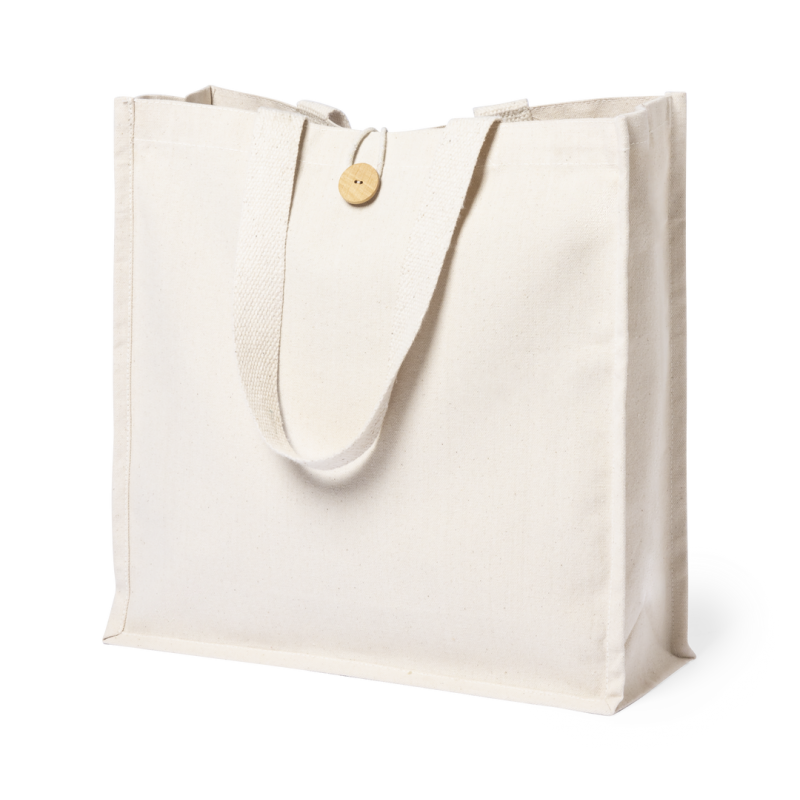Bolsa fabricada en algodón 100%, de acabado natural y en gramaje extra de 310g/m2. Con original cierre de botón, acabado cosido y con fuelle. Asas medianas extra anchas y reforzadas (60 x 3,5 cm). Resistencia hasta 10 kg de peso.
