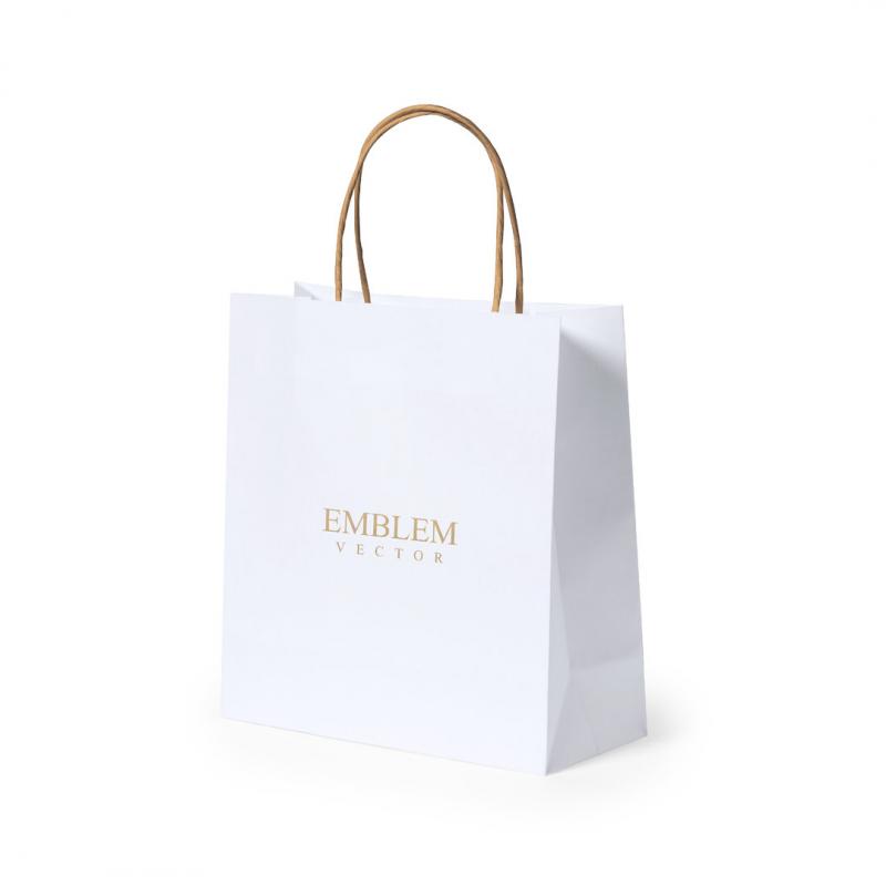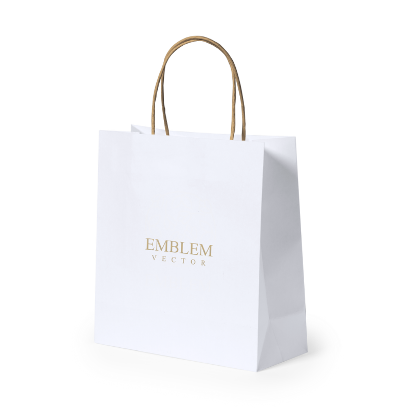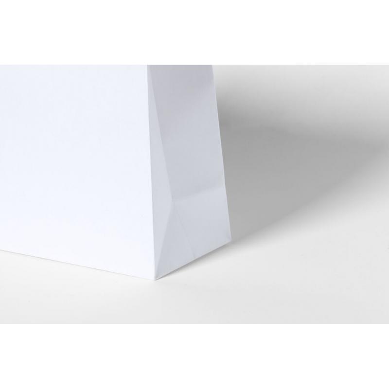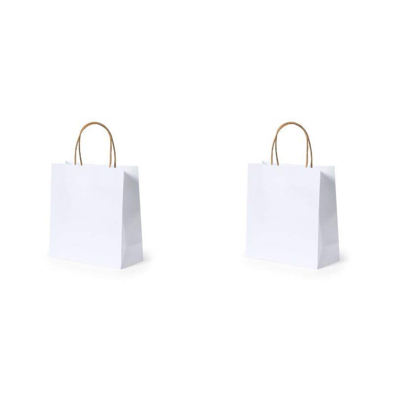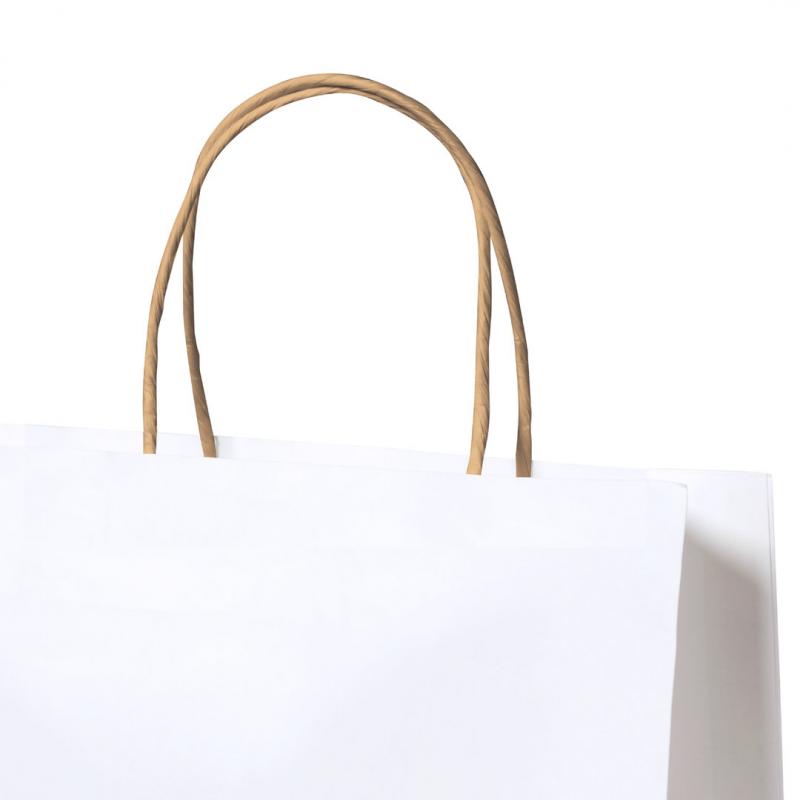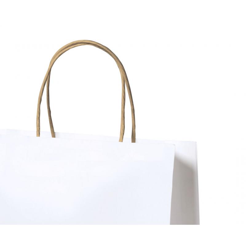 Bolsa de línea nature, fabricada en papel reciclado acabado en blanco de 100g/m2, con asas cortas reforzadas en tono natural y fuelle. Resistencia hasta 6 kg de peso.