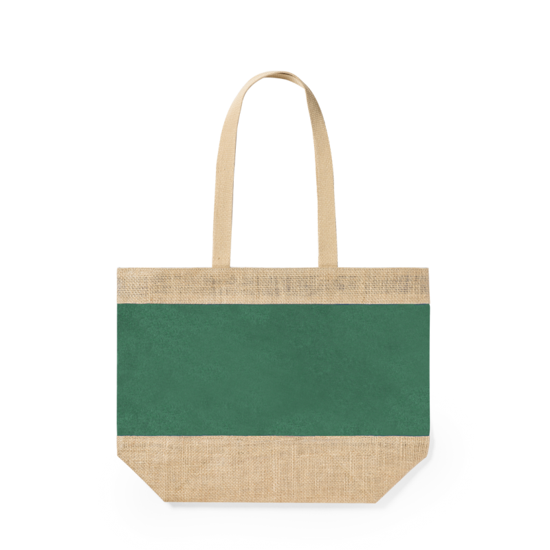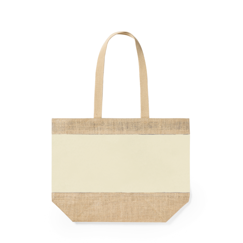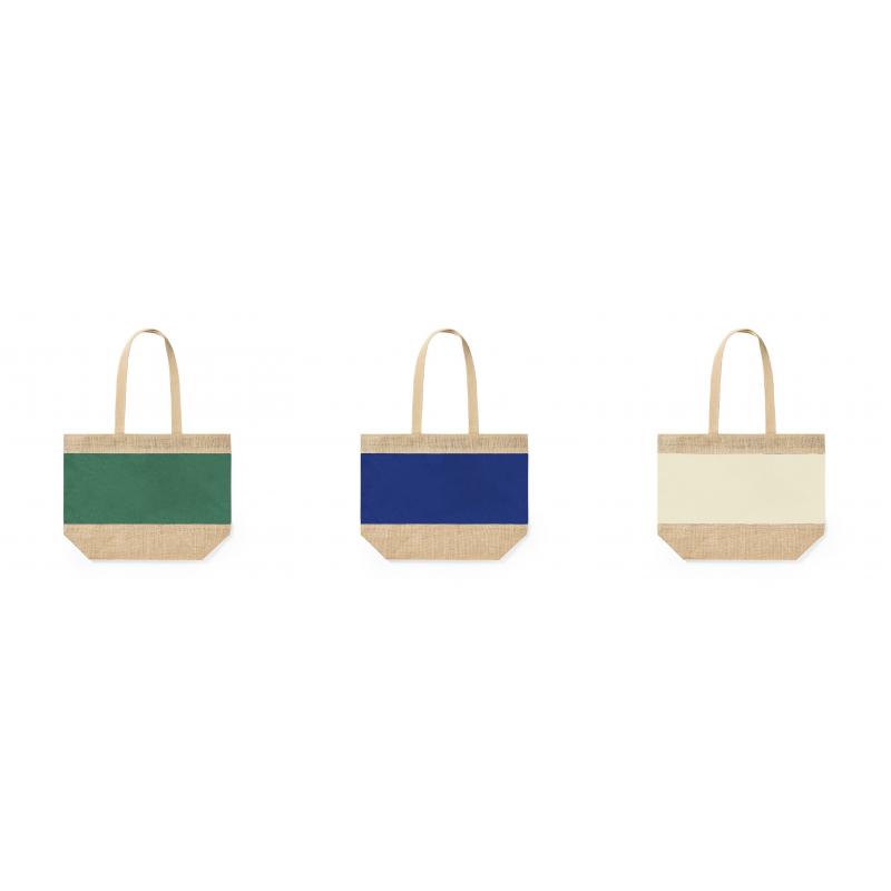 Bolsa en resistente combinación de yute laminado y algodón laminado, con asas de algodón natural. De acabado cosido, con asas largas reforzadas y disponible en amplia gama de colores. Resistencia hasta 10kg de peso.