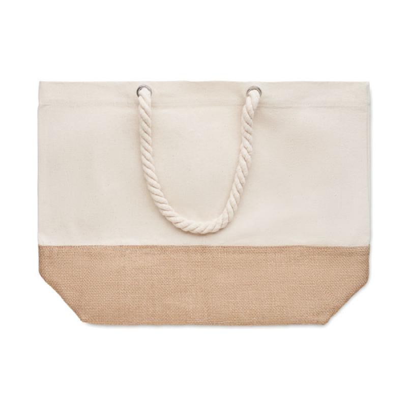 Bolsa de playa o de compras en canvas con asa en forma de cordón y base de yute. 280 gr/m².
