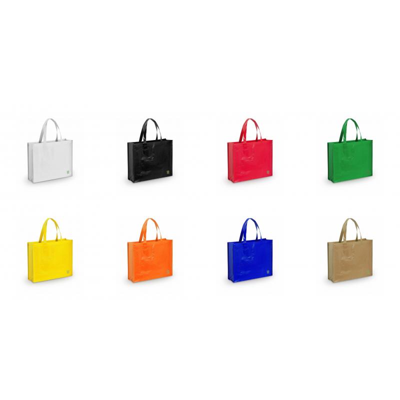 Bolsa en non-woven laminado de acabado brillante. En variada gama de vivos colores, con asas medianas reforzada de 48 cm de largo. De acabado cosido, con fuelles y ribetes reforzados.