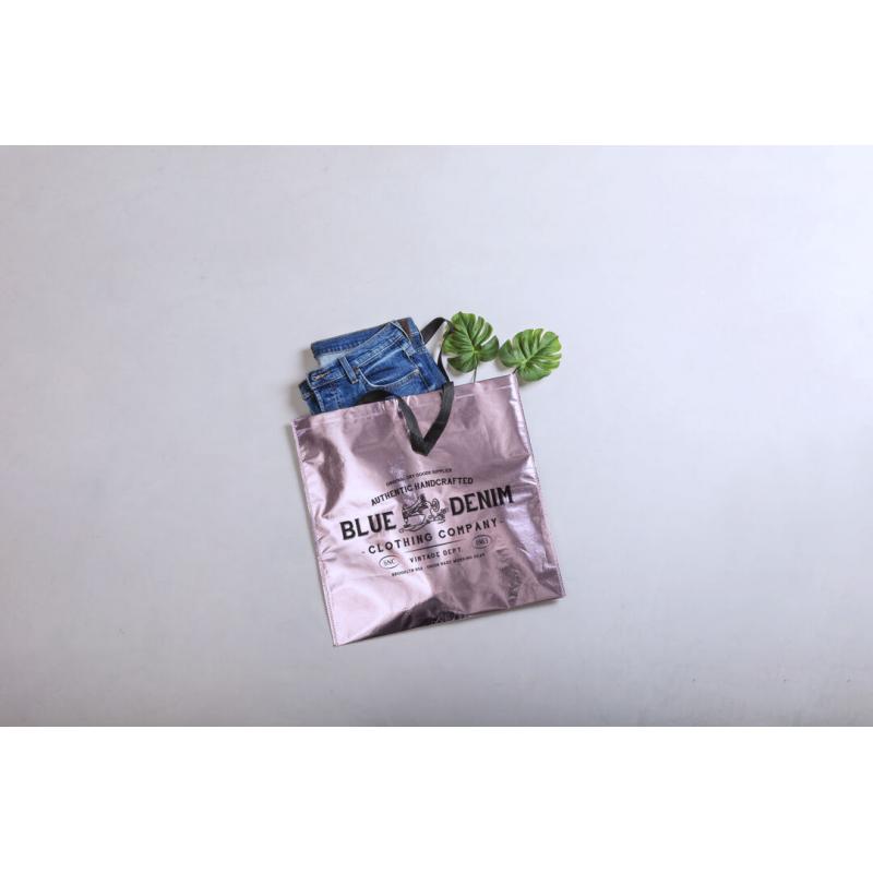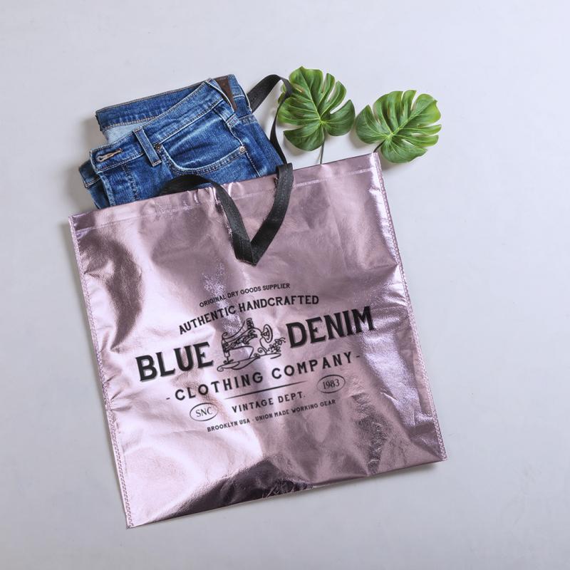 Bolsa en non-woven laminado de acabado metalizado. Disponible en colores dorado, plateado y oro rosa. Con asas medianas reforzadas de 42 cm de largo. De acabado termosellado, con fuelles y ribetes reforzados. Resistencia hasta 7kg de peso.