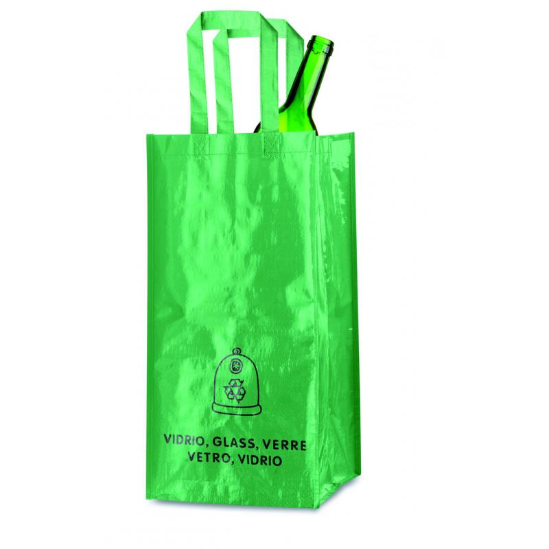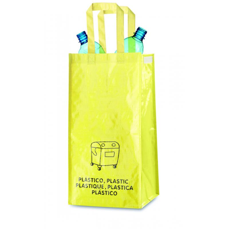 Set de 3 bolsas de reciclaje amarilla-verde-azul en resistente pp-woven laminado de 125g/m2 de acabado brillante. Incluye 3 bolsas de 23x45x23cm unidas entre sí mediante resistentes velcros laterales. Con asas reforzadas e indicación de tipos de residuo: plástico y envases, vidrio y papel.