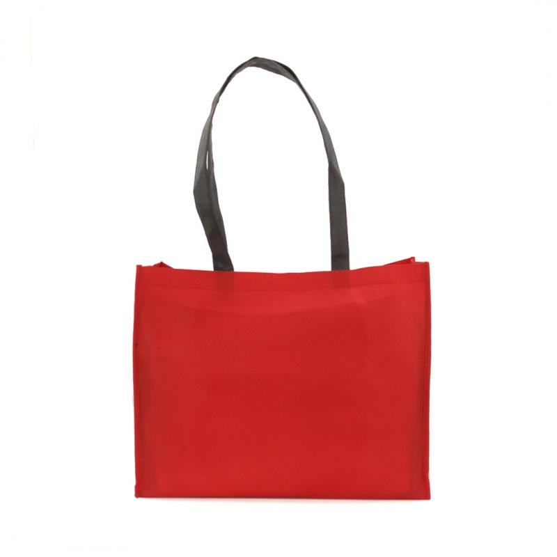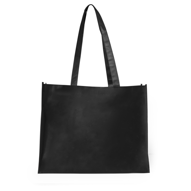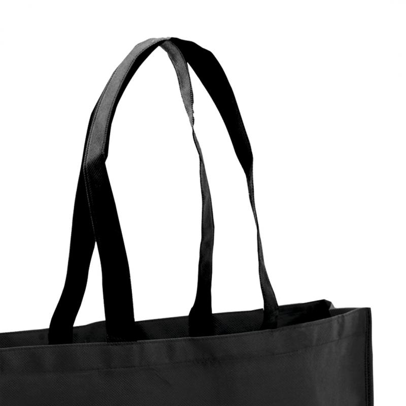 Bolsa en non-woven de 100g/m2, en variada gama de vivos colores. Con asas largas de 70cm en color negro, fuelle reforzado con ribete a juego y acabado cosido.